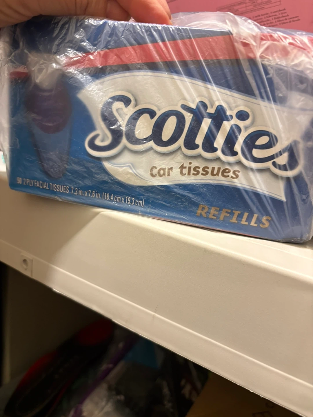Pack of Scotties car tissues, perfect for keeping your vehicle tidy. These are 2 ply facial tissues, and the package contains refills. Each tissue measures 7.2 in. x 7.6 in. (18.4 cm x 19.3 cm).