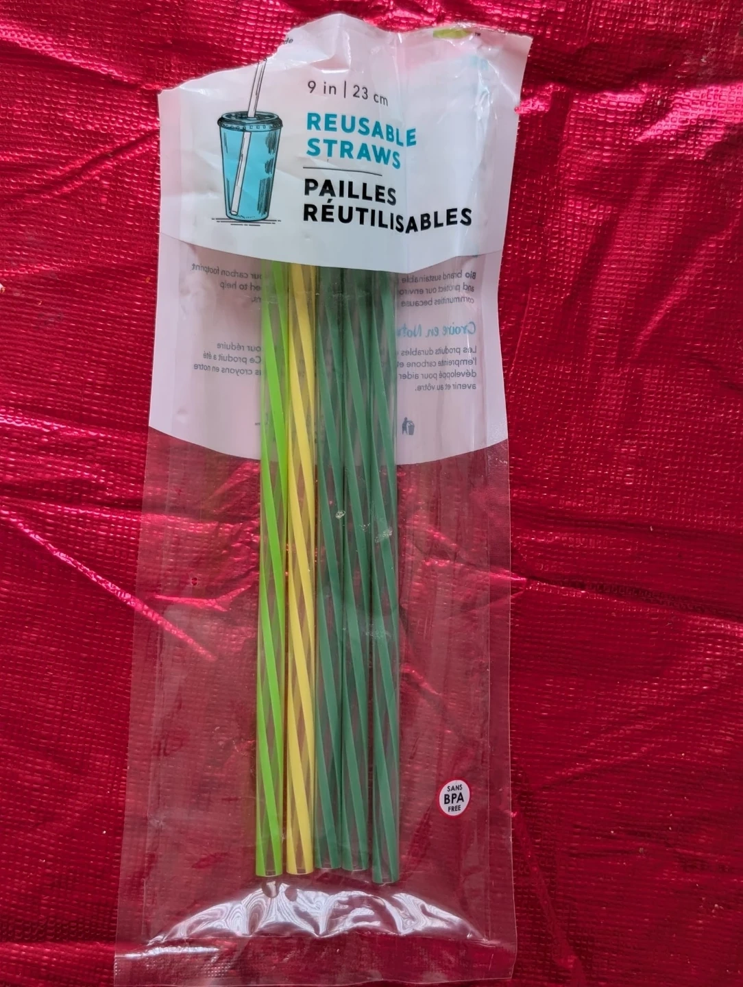 Set of reusable straws, 9 inches long. Comes in green and yellow colours. BPA-free plastic construction.