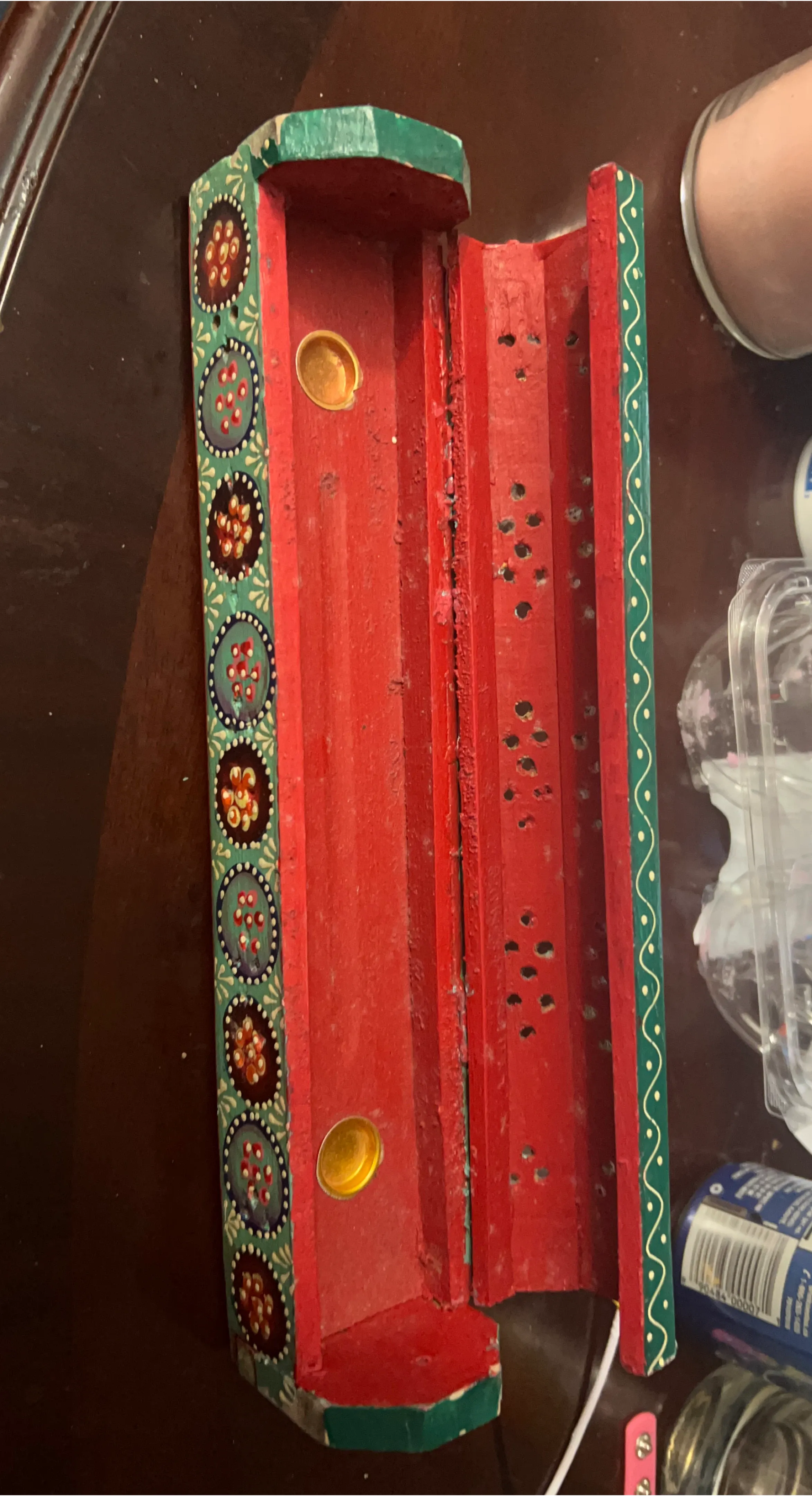 This decorative wooden box is painted red with green trim and colourful floral designs. It has small brass-like cups inside and holes along the sides for incense sticks. This item is great for creating a fragrant atmosphere.