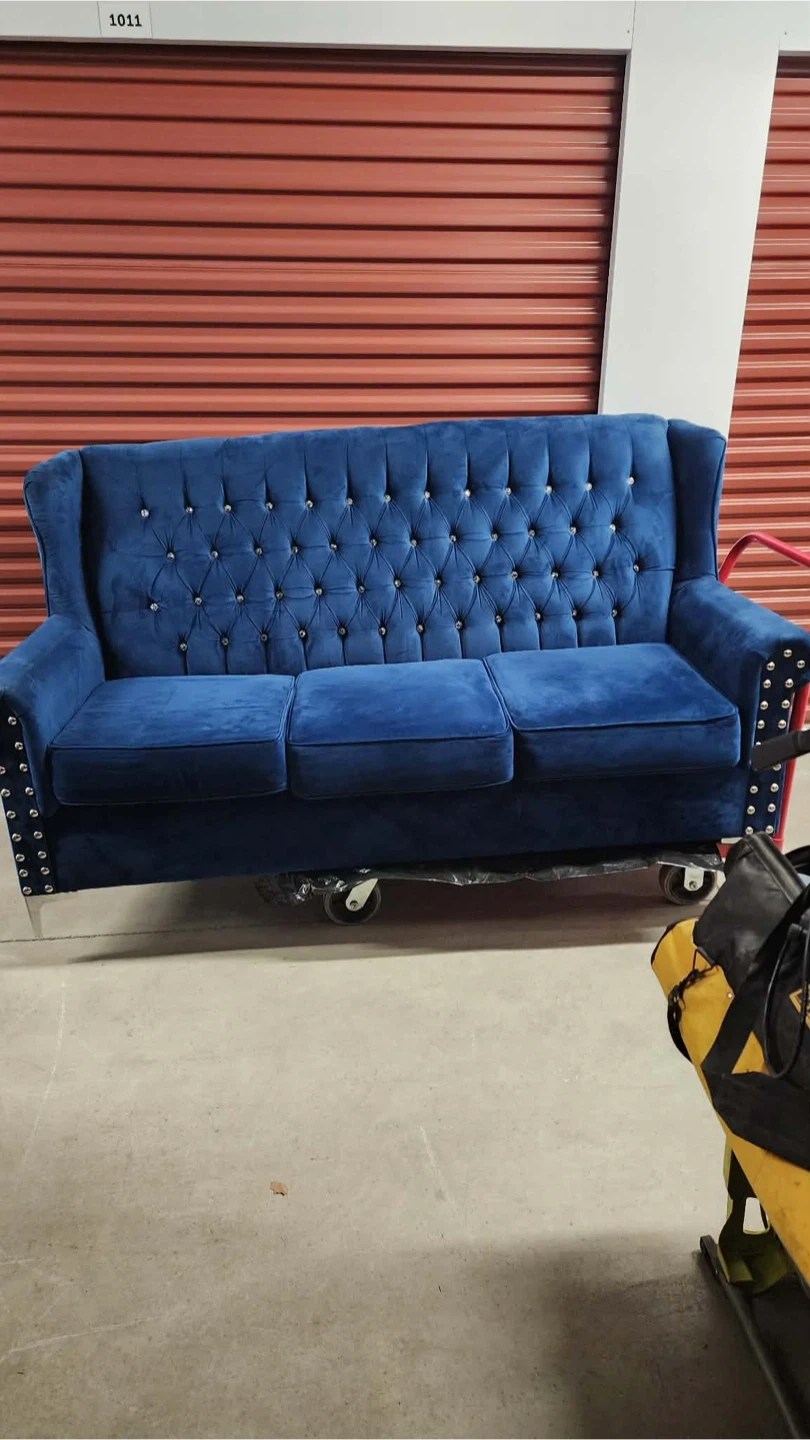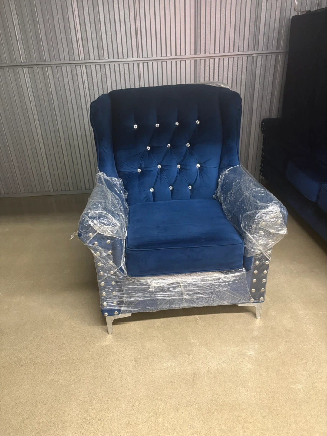 Classic deep button tufted sofa upholstered in a rich royal blue velvet fabric. It's detailed with silver nailhead trim and sits on decorative silver legs. This sofa adds a touch of elegance to any living space. It's approximately 7.5 feet long.