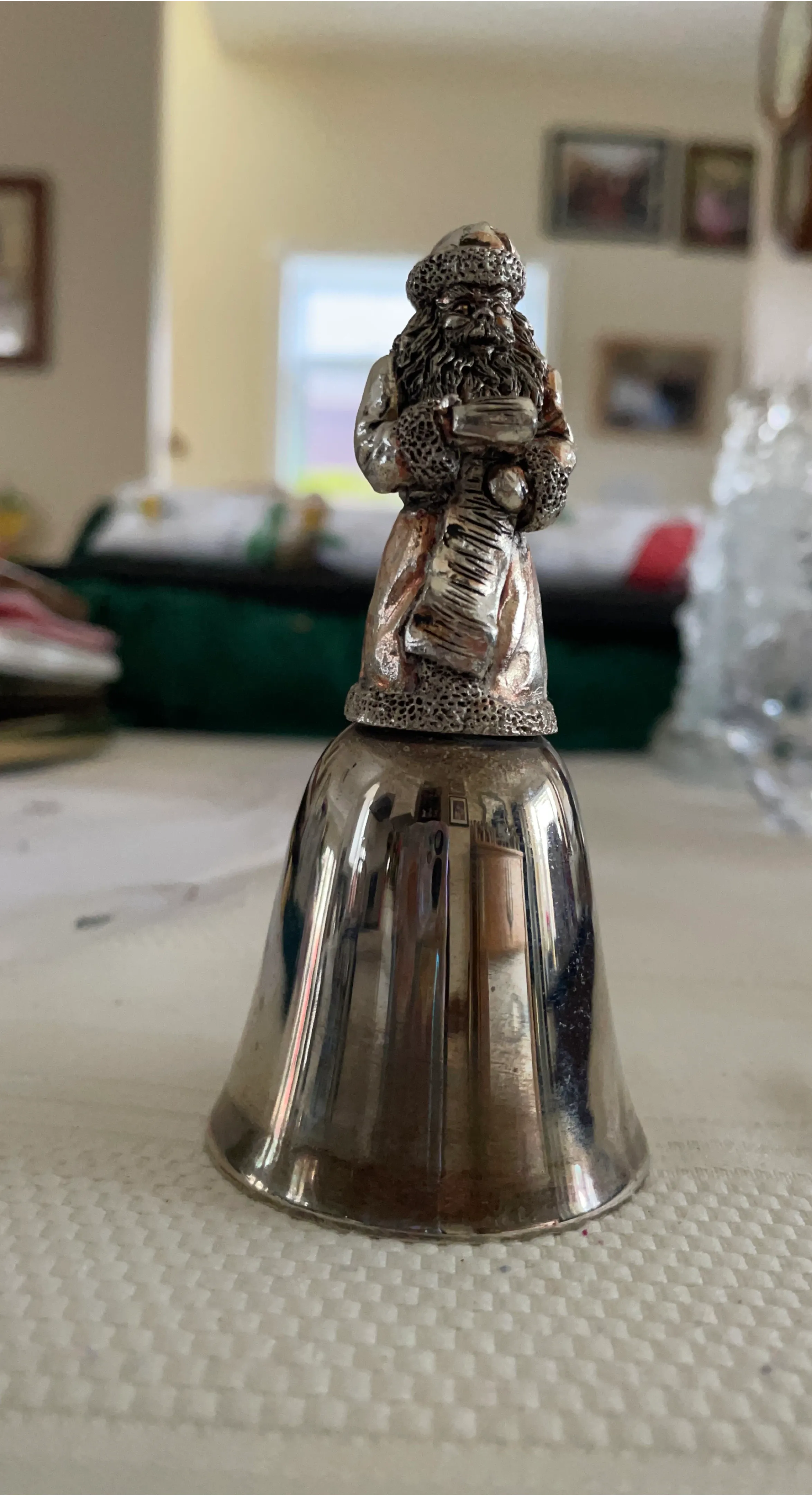 This is a silver-toned bell featuring a detailed Santa Claus figurine at the top. It's a charming decorative piece perfect for the holiday season. The bell has a classic, flared shape and the Santa figure is adorned with a fur-trimmed hat and coat.