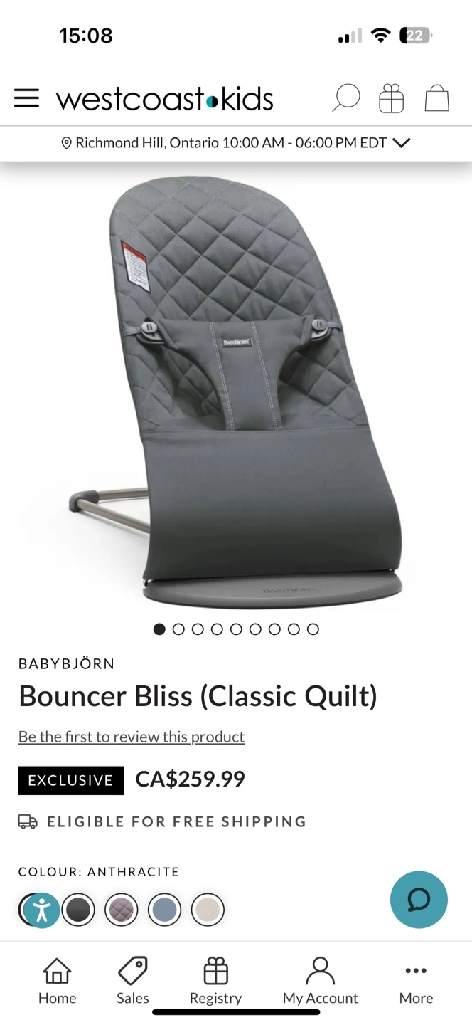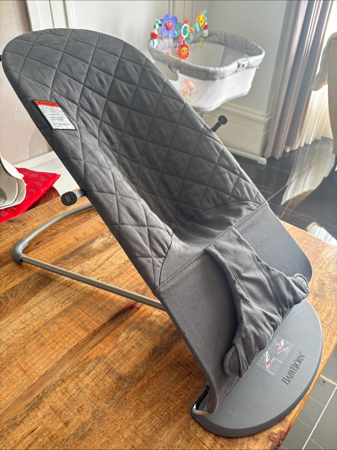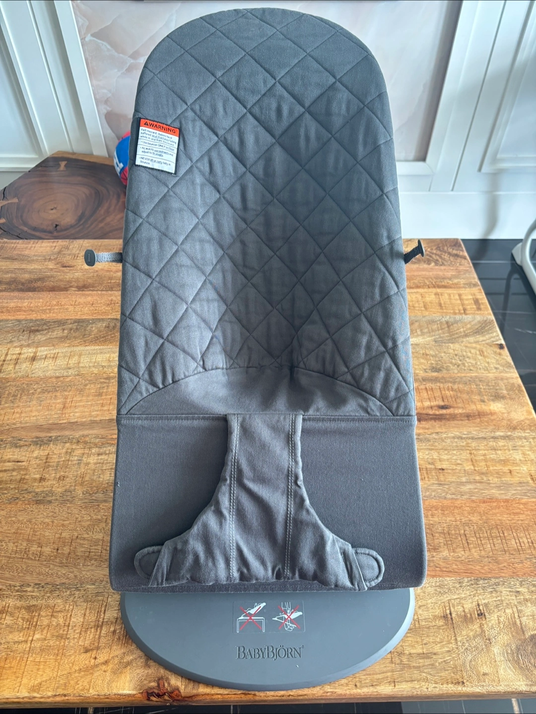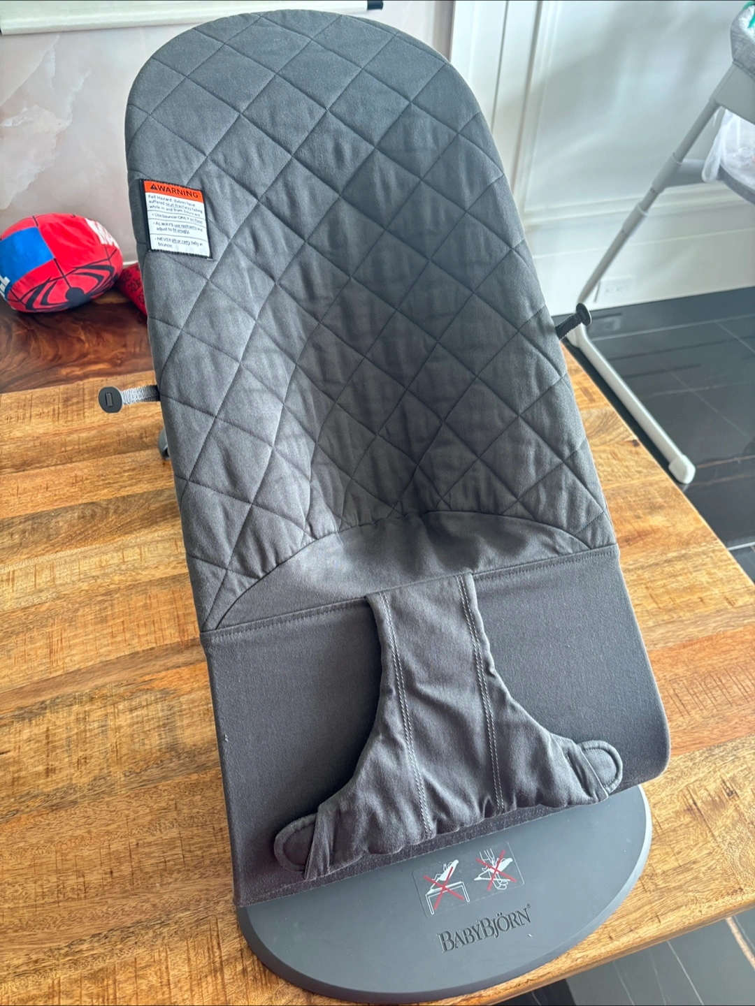 BabyBjorn Bouncer Bliss in anthracite grey. Classic quilt fabric. Gently used, excellent condition.