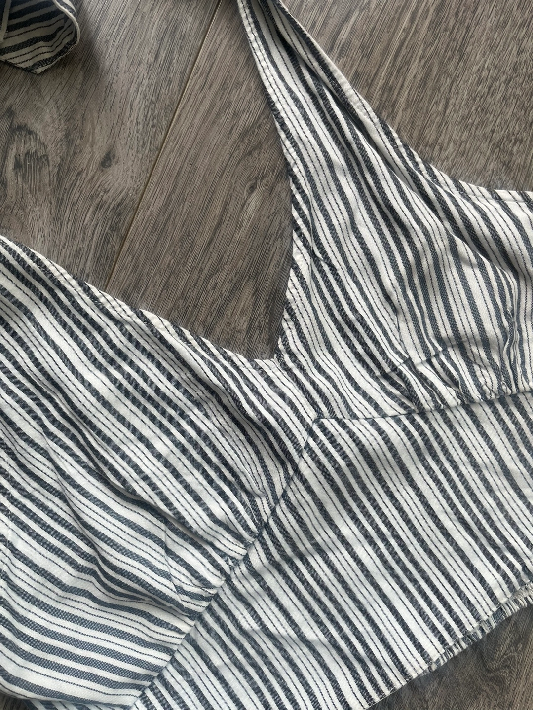 Adorable blue, grey and white striped halter crop top. Features a v-neck and adjustable straps. Elasticated band at bottom. Lightweight fabric. Perfect for summer. Size medium. Never worn.