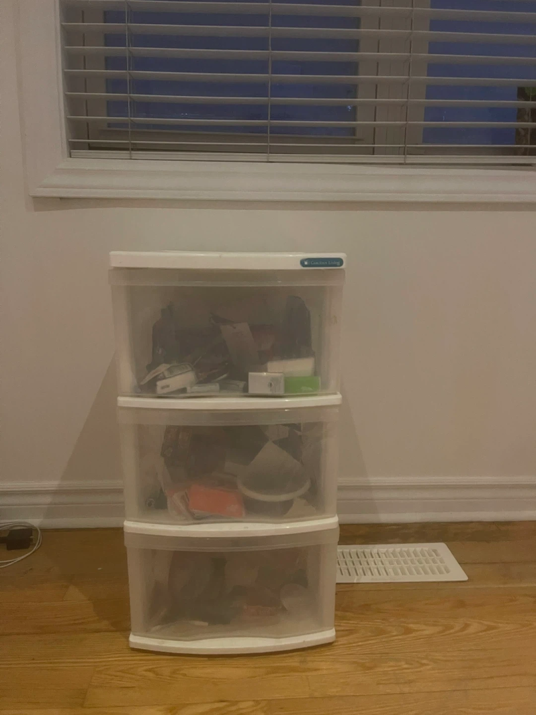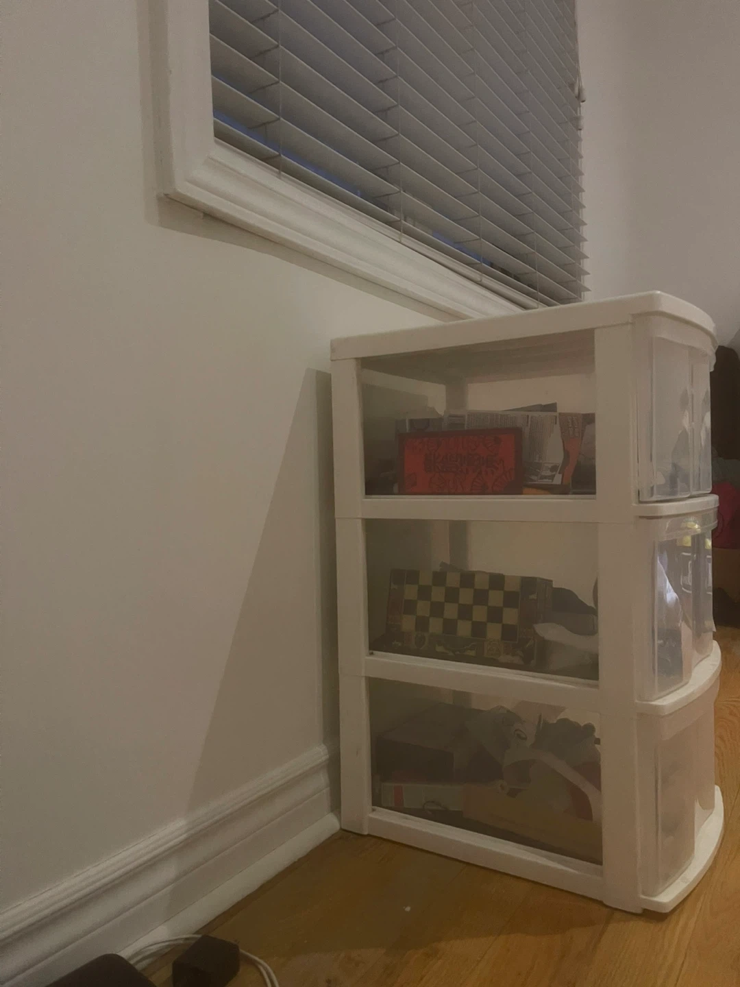 This is a 3-drawer plastic storage unit. It's white with clear drawers. Great for organizing small items!