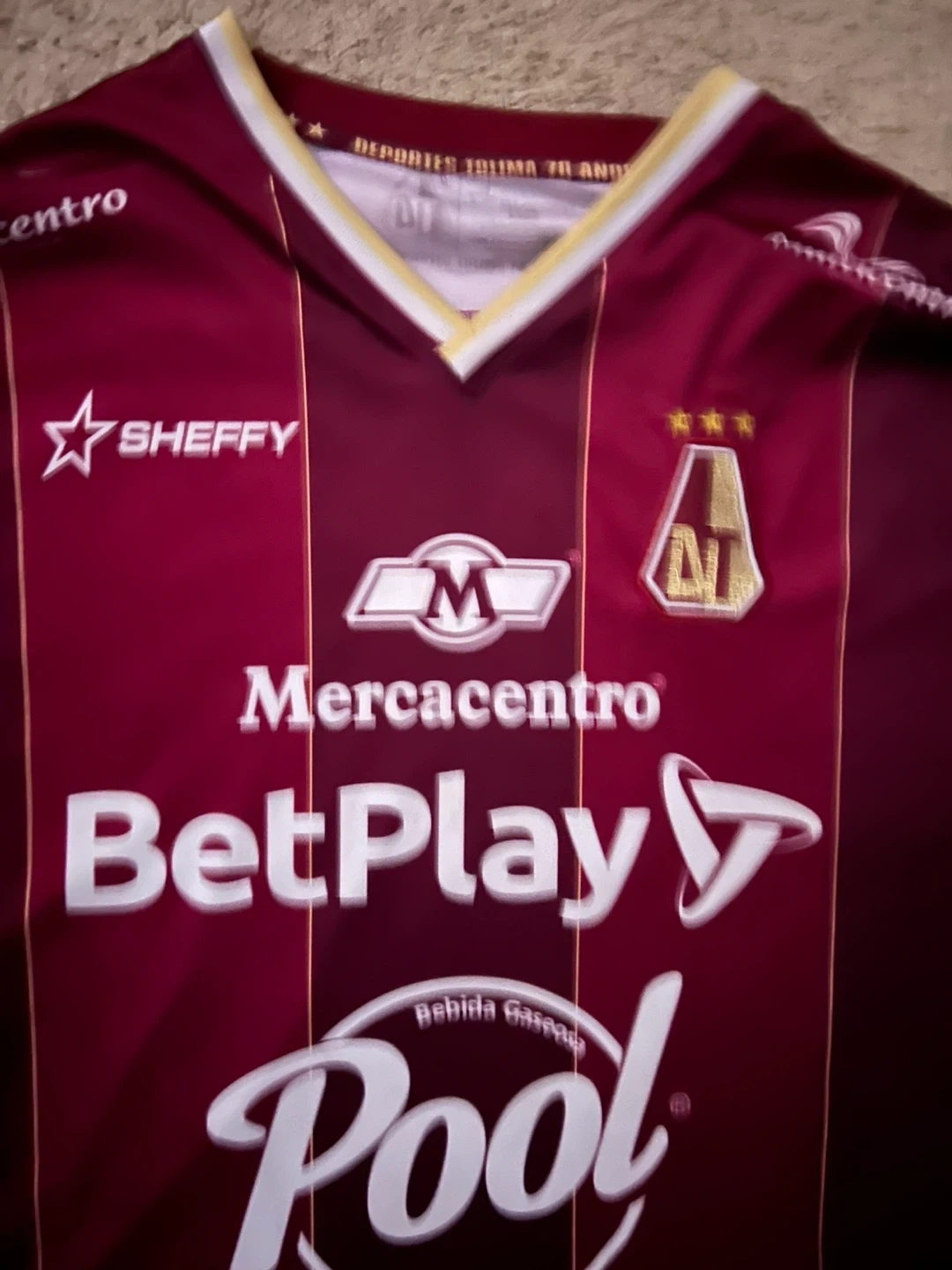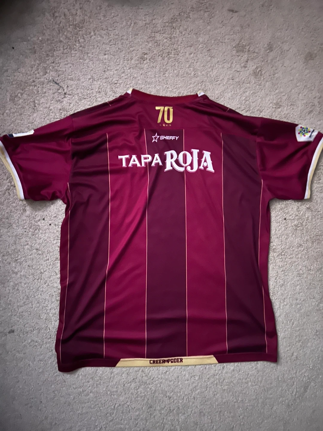 Maroon soccer jersey with white and gold accents. Features multiple sponsor logos on the front, including BetPlay and Pool. The back displays the number 70 and 'TAPA ROJA'.