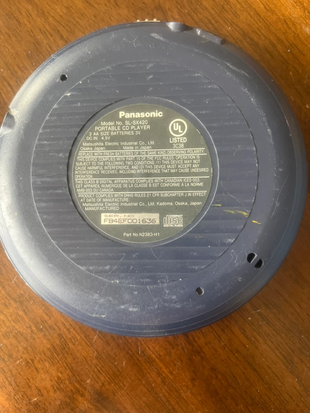 This is a portable Panasonic CD player that supports MP3 playback. It features an anti-skip system for uninterrupted listening. Powered by two AA batteries.