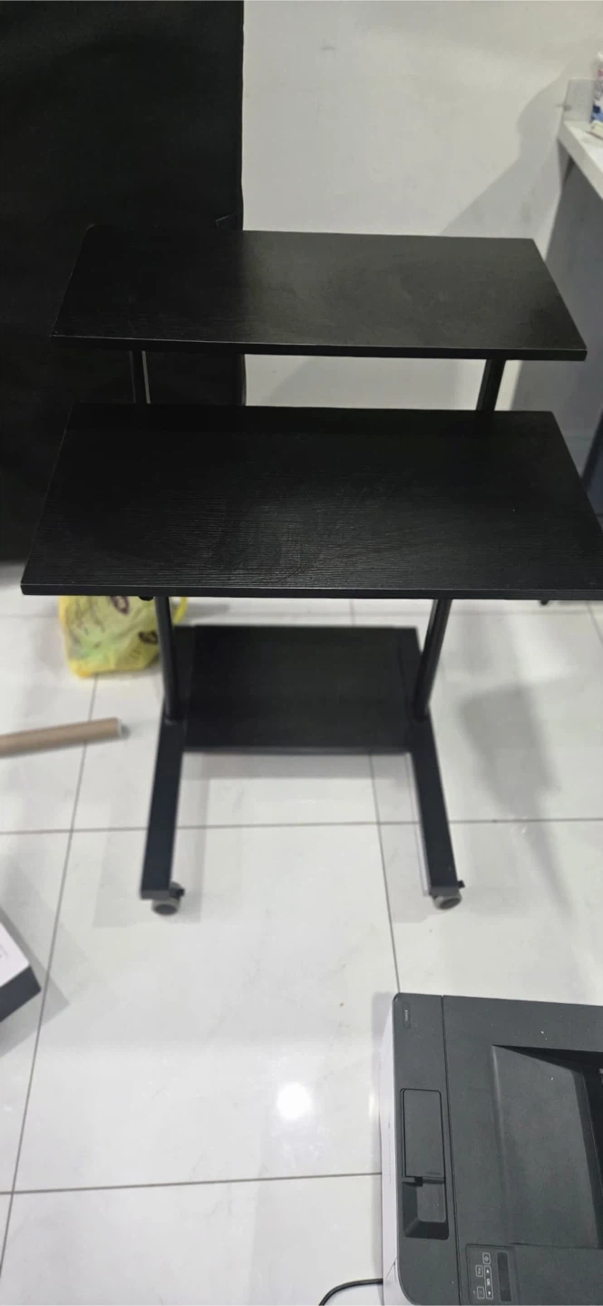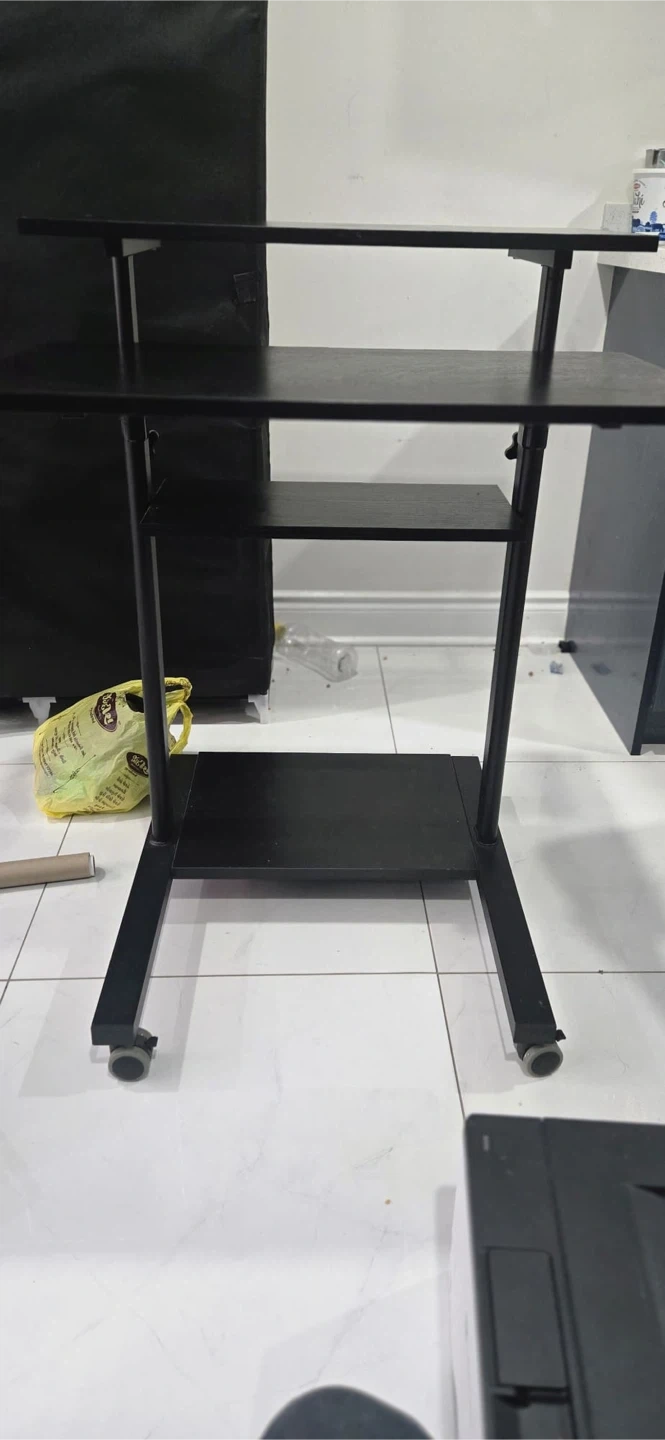 This VIVO standing desk table is black and has two tiers for your computer and accessories. It's on wheels for easy movement. The height is adjustable for comfortable use.