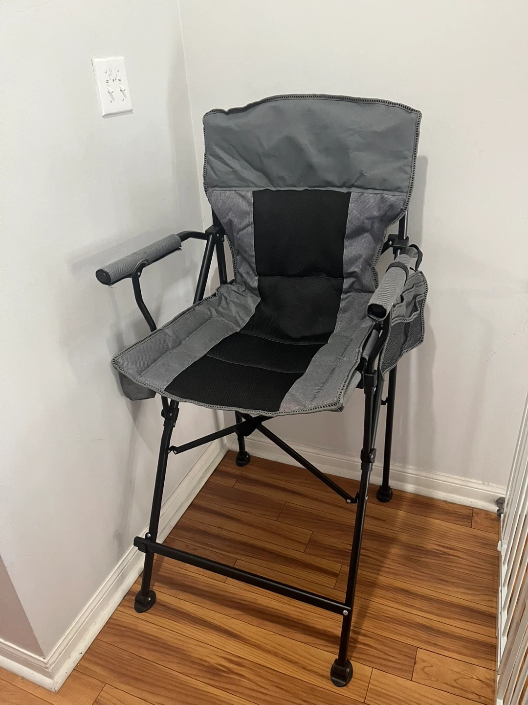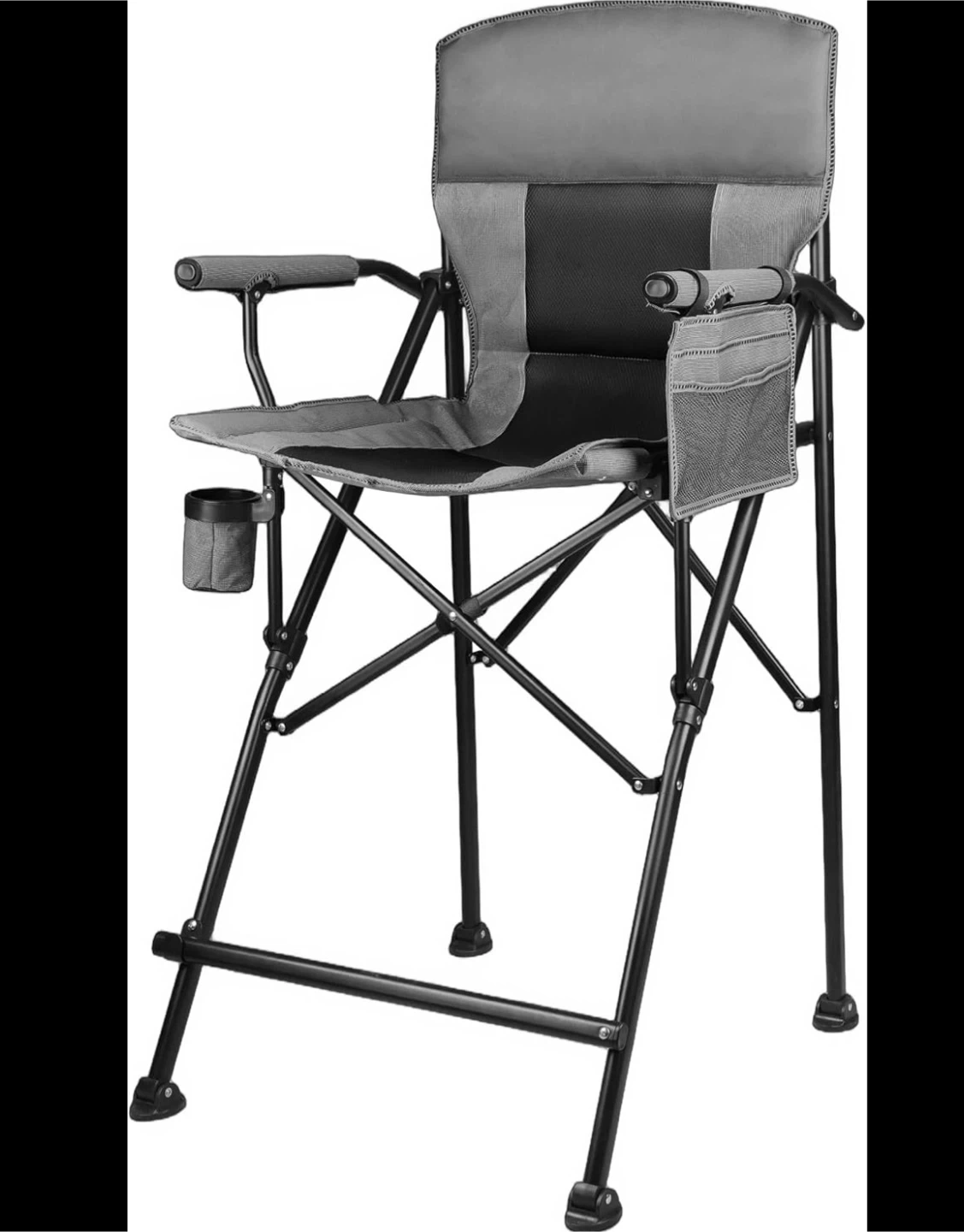 This is a grey folding directors chair. It's designed for comfort with a padded seat and back. Features a built-in cup holder on the side.