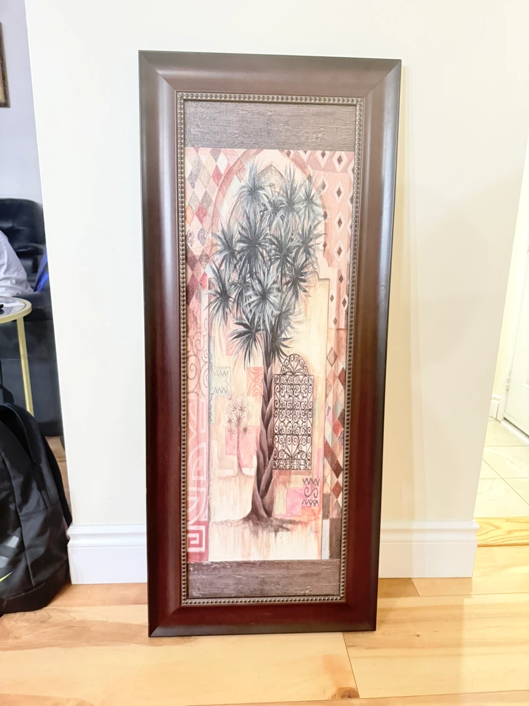 This framed wall art features a print of a tropical tree with intricate geometric patterns in the background. It's set in a dark brown, rectangular frame with a distressed wood-look insert. The art piece brings a touch of nature and exotic design to any room. It's ready to hang and adds a decorative element to your living space.