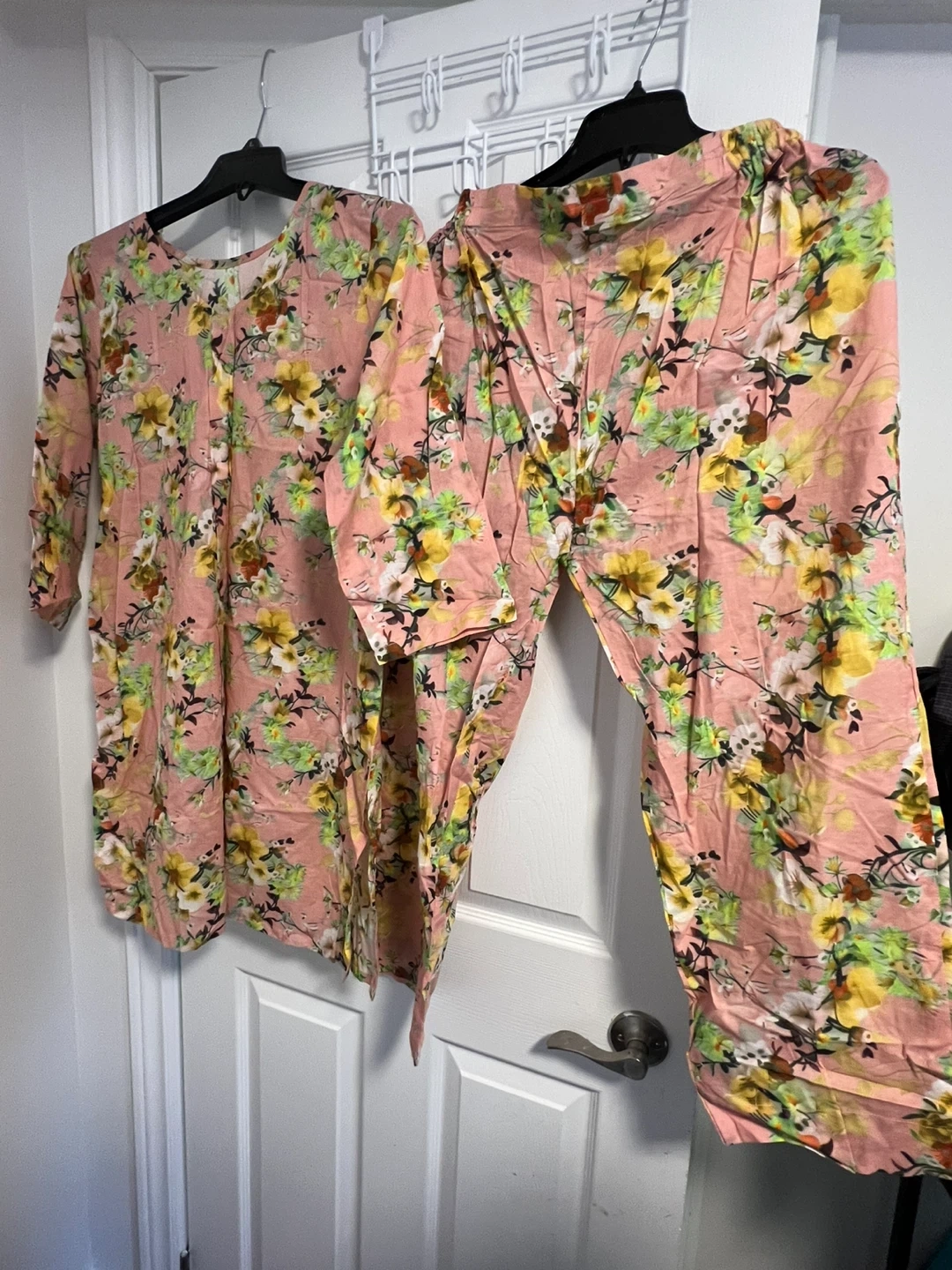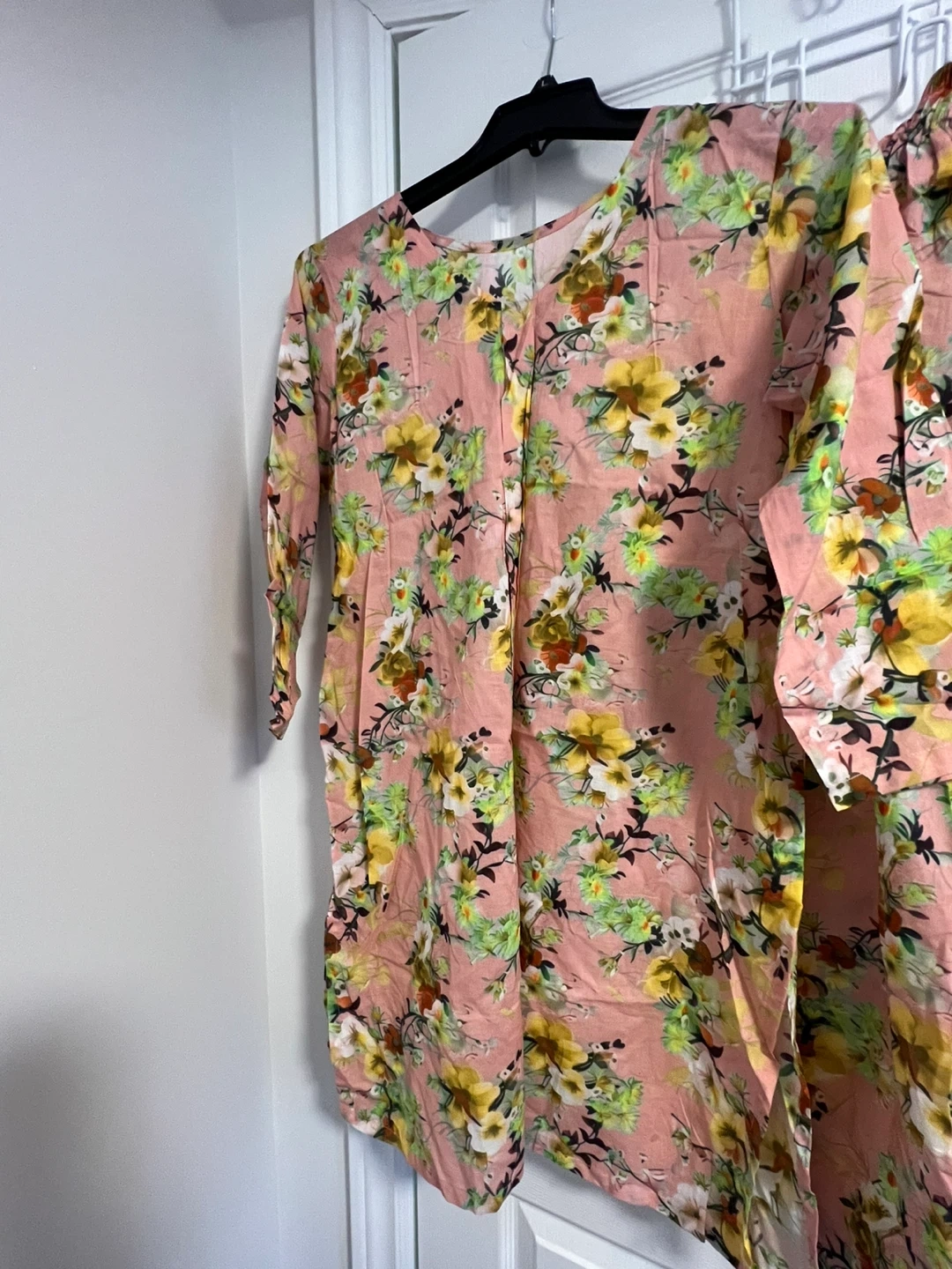 A lovely pink kurti and pants set featuring a vibrant floral print. The kurti has a relaxed fit with 3/4 sleeves. This comfortable two-piece outfit is perfect for casual wear or summer 3 colours available