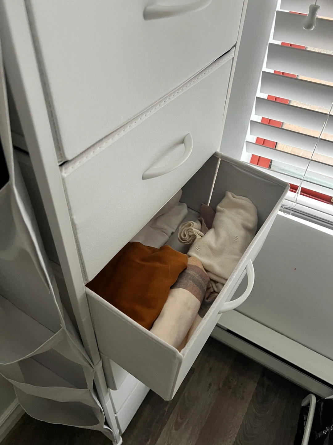 White fabric dresser with 6 drawers for storage. It also includes convenient side pockets for extra organization. Perfect for small spaces needing tidy storage!