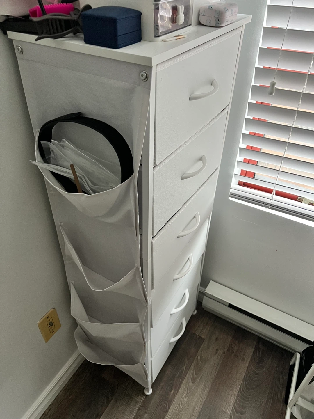 White fabric dresser with 6 drawers for storage. It also includes convenient side pockets for extra organization. Perfect for small spaces needing tidy storage!
