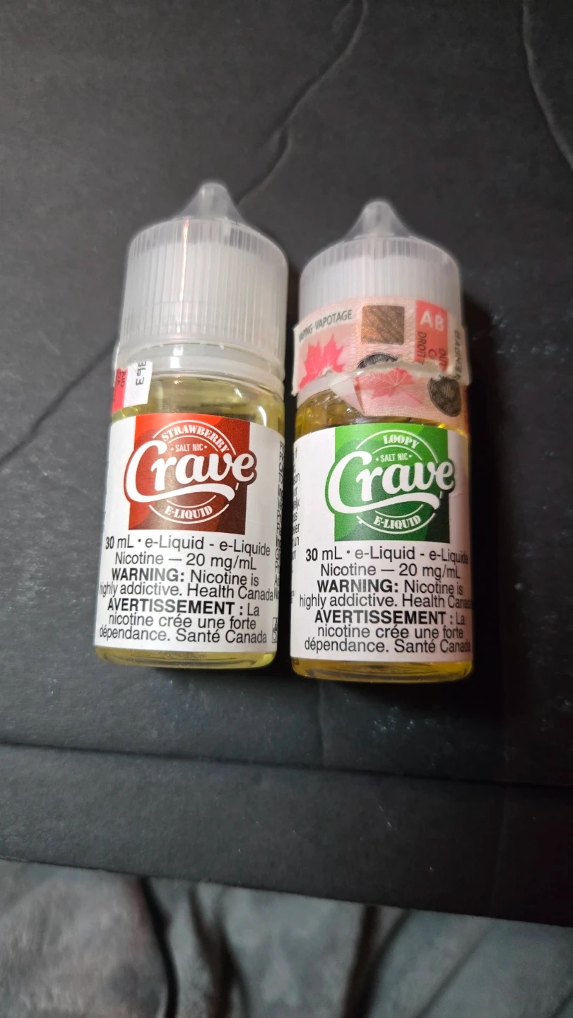 Two bottles of Crave E-Liquid, one Strawberry flavour and one Loopy flavour. Each bottle is 30 mL and contains 20 mg/mL almost full price is for both. 40$