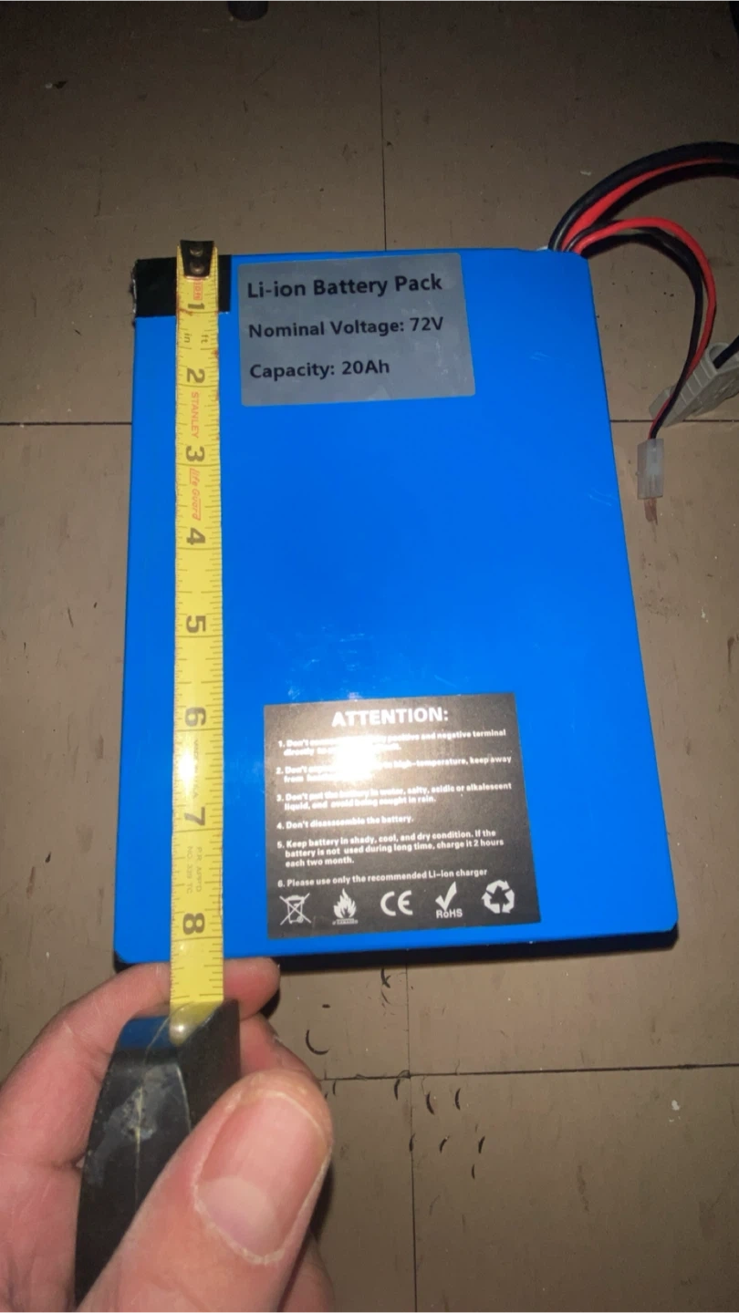 A 72-volt, 20 amp-hour Li-ion battery pack. It measures approximately 8 inches long, 4.5 inches wide, and 3 inches high. Used for powering electric devices was recently taking out of electrical dirt bike
