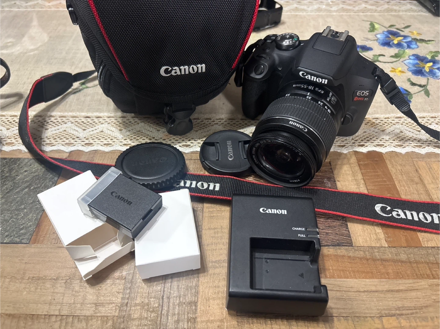 Selling urgent ‼️ Canon EOS Rebel T7 digital camera kit. It includes the camera body, a Canon EF-S 18-55mm lens, a Canon charger, a camera bag, and a SanDisk Extreme PRO 128GB SD card. This kit is ready for capturing photos and videos!