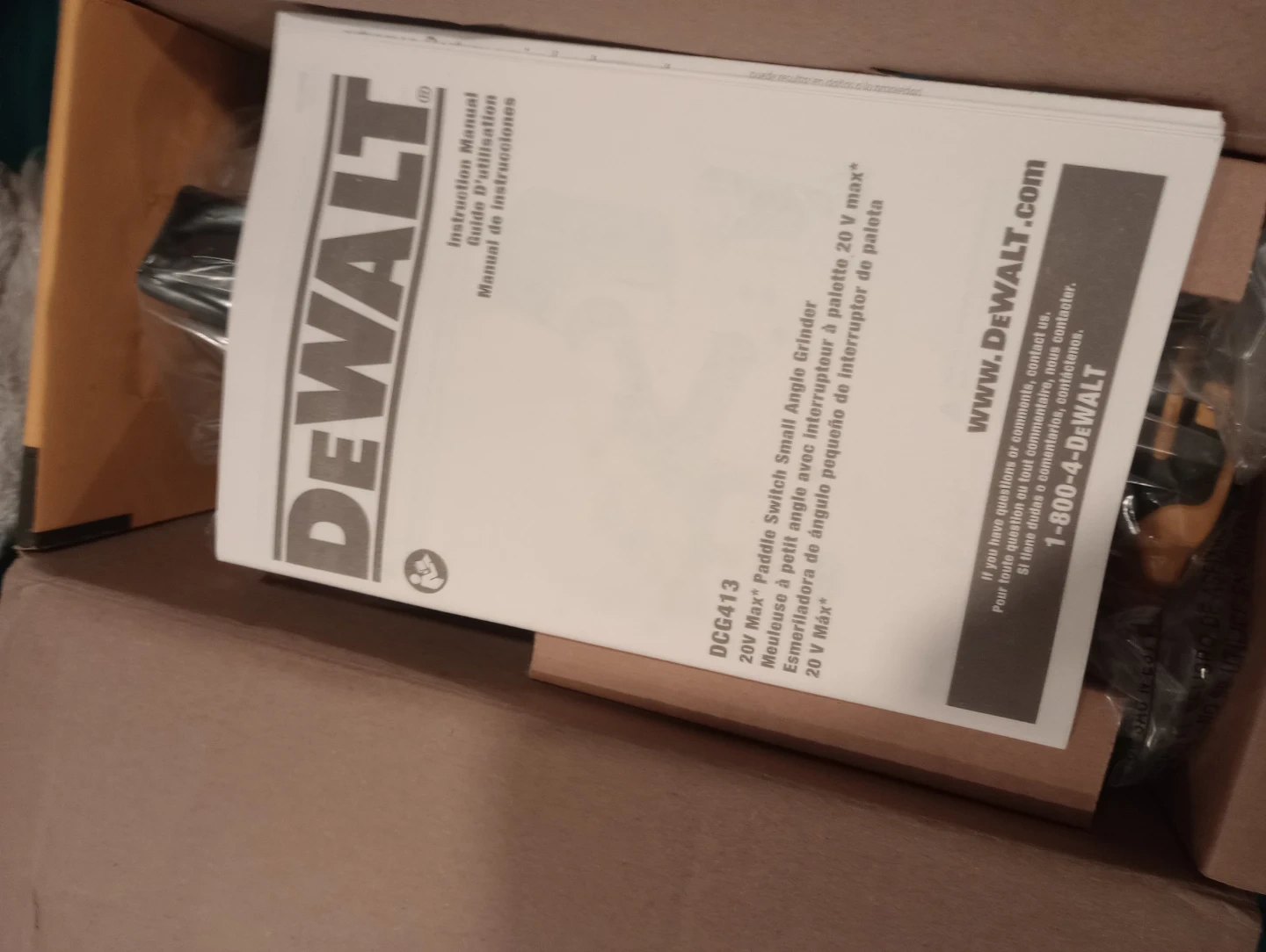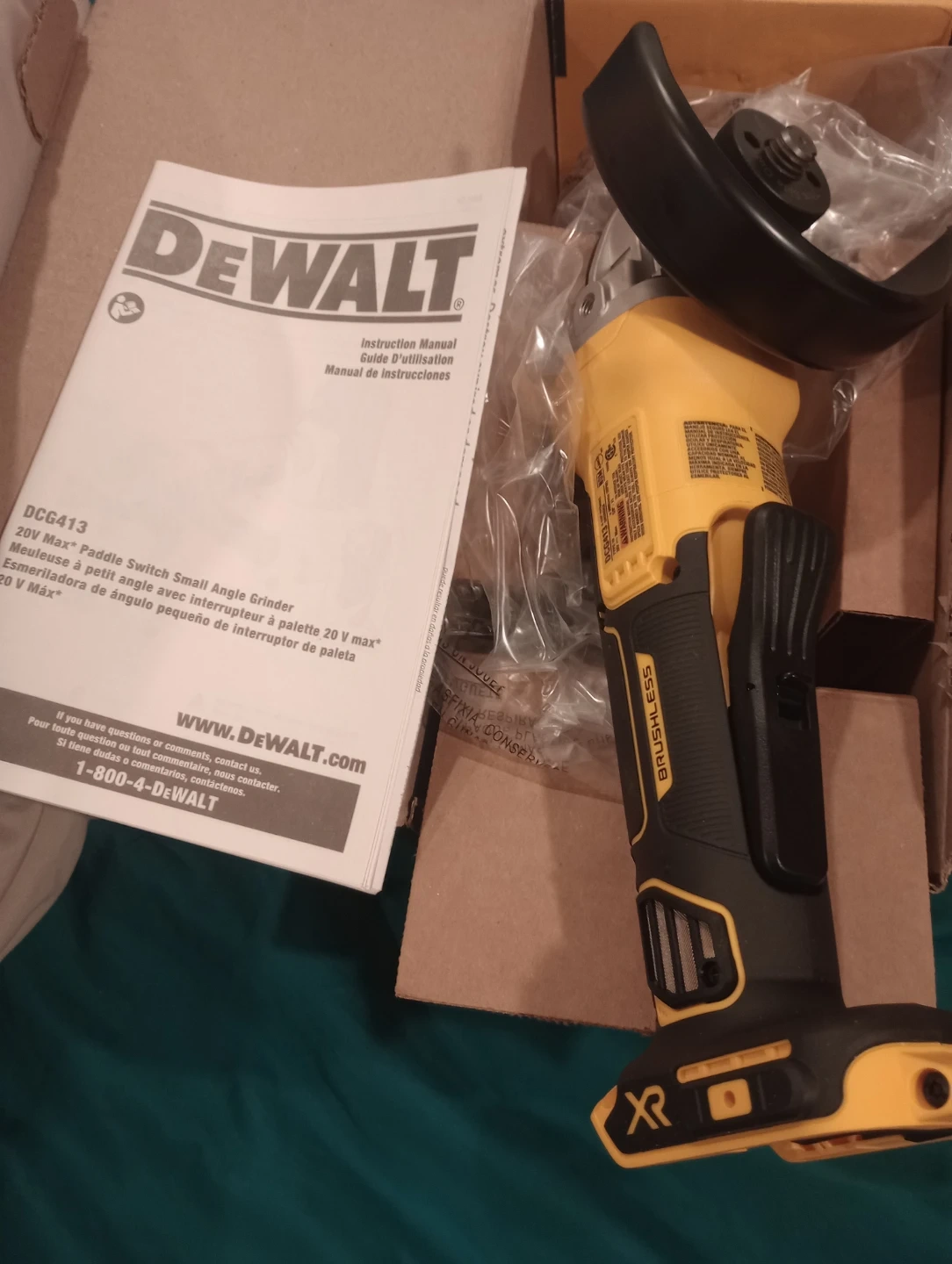 This is a DEWALT 20V Max* paddle switch small angle grinder. It features a brushless motor and XR technology. Includes the instruction manual.