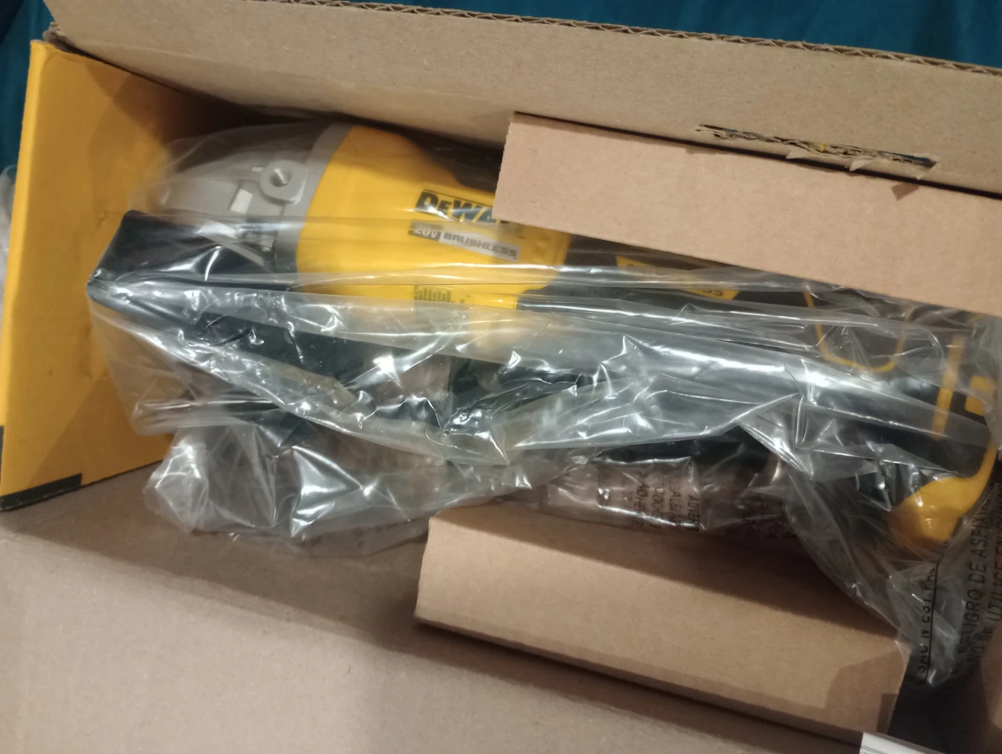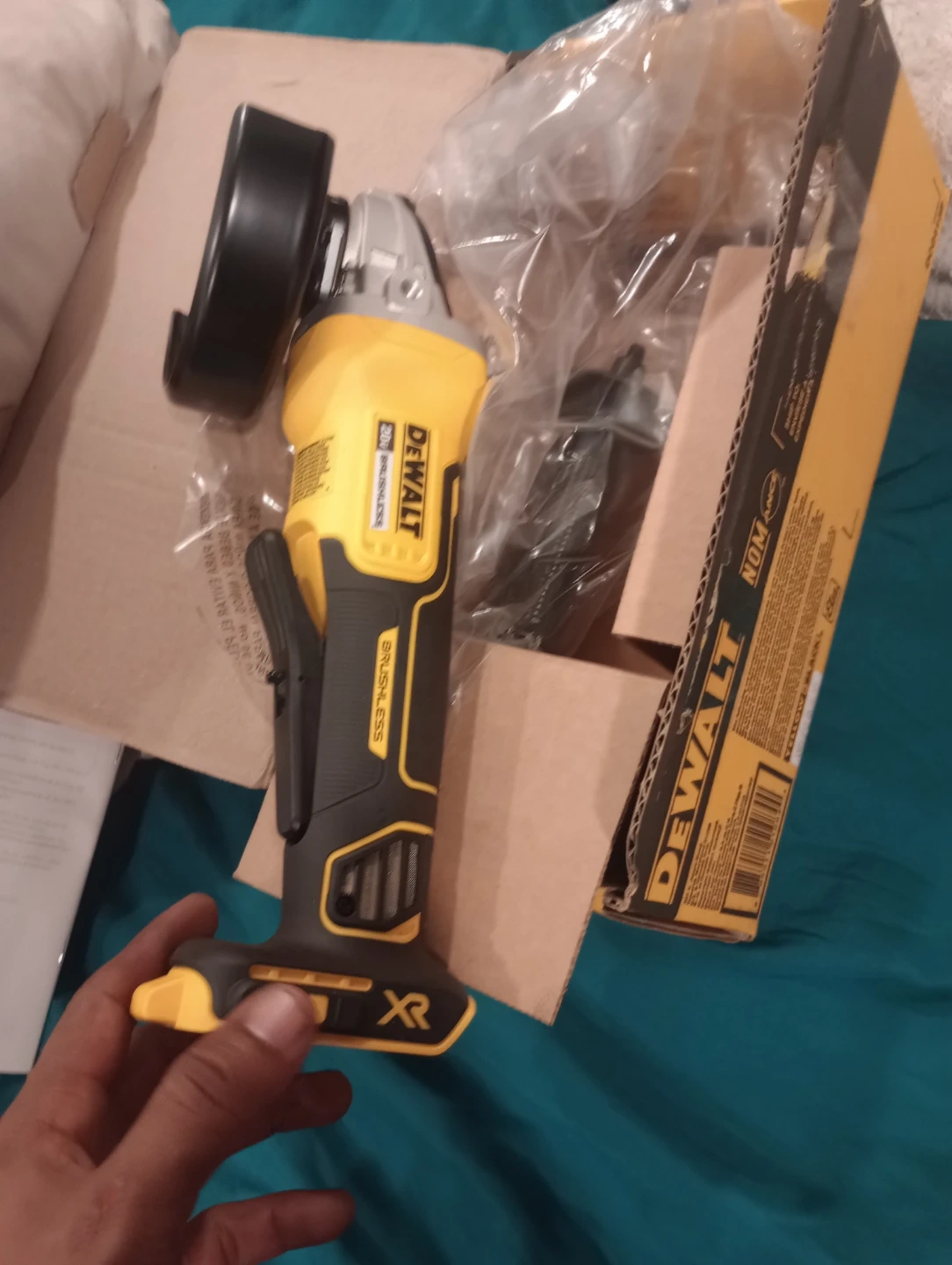 This is a DEWALT 20V Max* paddle switch small angle grinder. It features a brushless motor and XR technology. Includes the instruction manual.