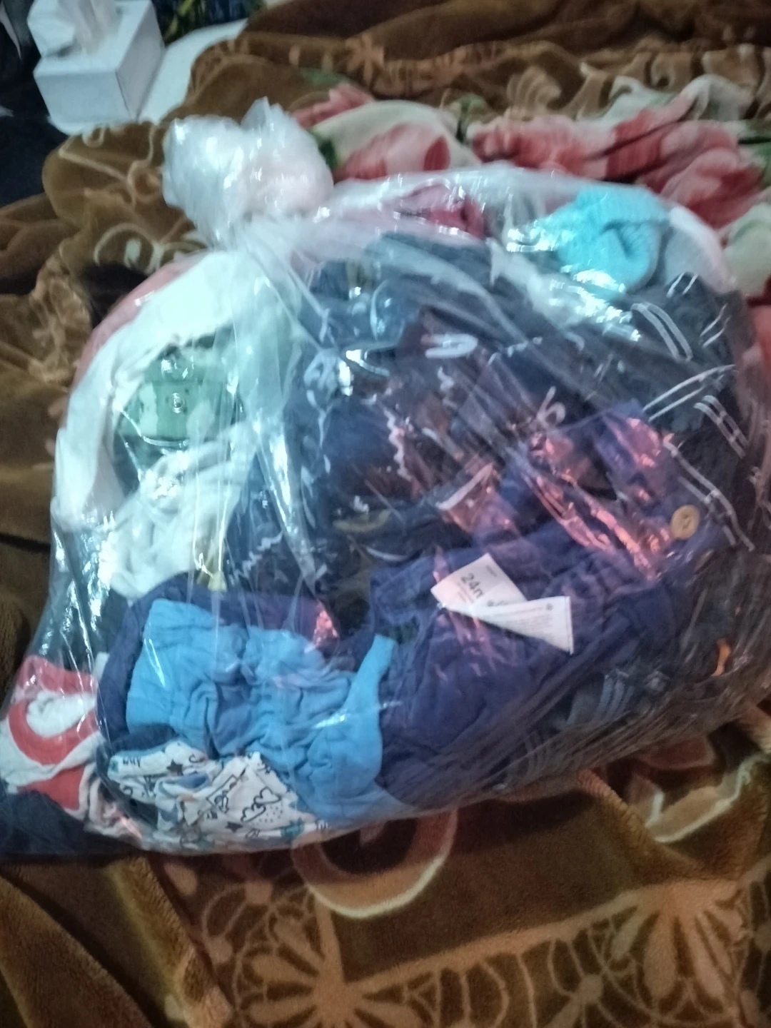 Assorted baby clothes in a clear plastic bag. Includes onesies, shirts, and pants. Likely a mix of sizes and brands for infants and toddlers.