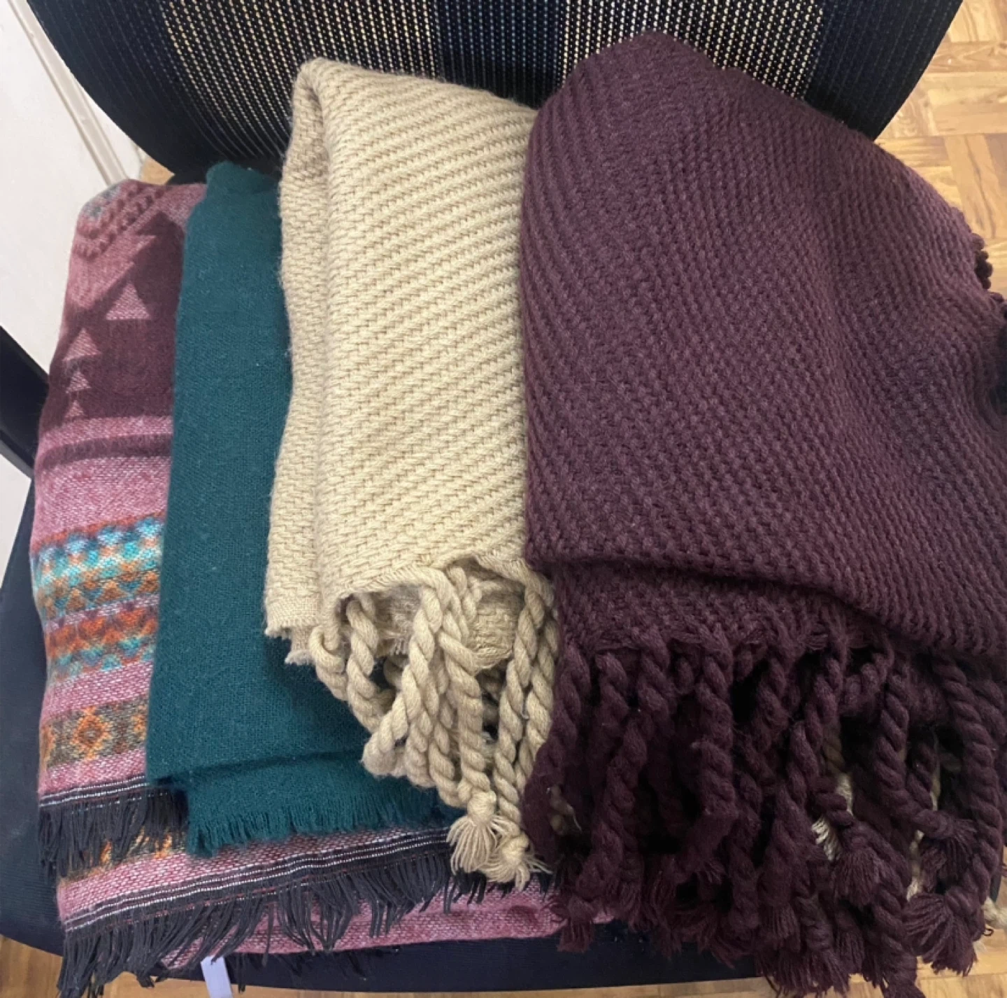 Here's a set of four knit scarves, perfect for keeping warm. They come in assorted colours and patterns, including a geometric design, a solid teal, a cream cable knit, and a rich plum. Each scarf has a lovely fringe detail.