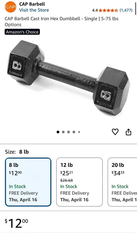 Buy & SellCAP 8lbs DumbbellsCAP 8lbs Dumbbells$152 unused 8lbs dumbbells for sale for $15 for both.WHERE TO MEETCheck LocationView MapSELLERMikeNorthgate161 review0 chats·0 favorites·7 viewsSEND CHAT TO SELLERHi Mike! I’m interested in your listing.Hi Mike! I’m interested in your listing.Get the Karrot app to chatSign In to chat