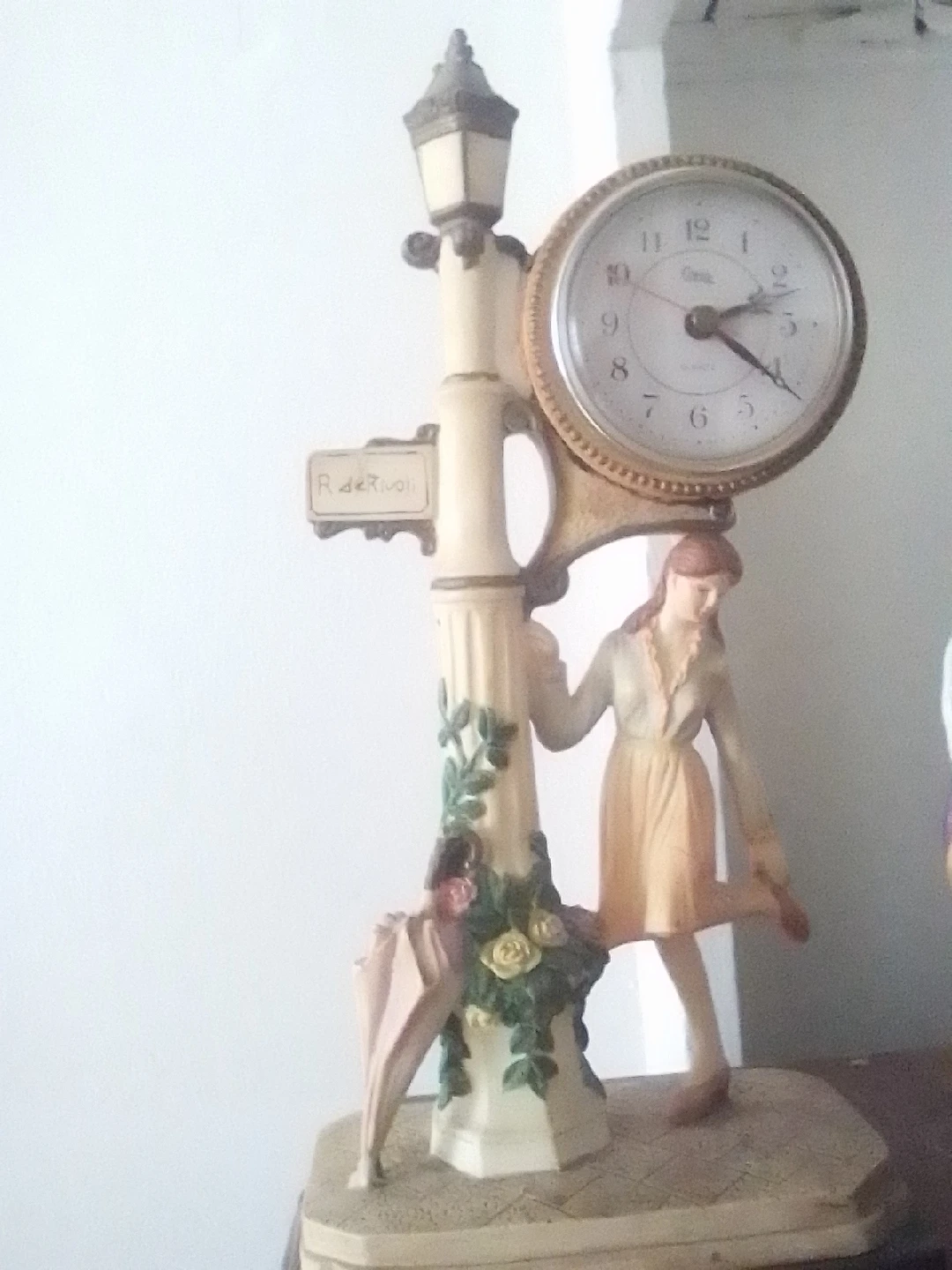 Selling a charming R. de Rivoli figurine clock! It features a woman, a street lamp, and lovely floral details. The clock face is easy to read, and it adds a touch of vintage elegance to any room. The clock runs on batteries.