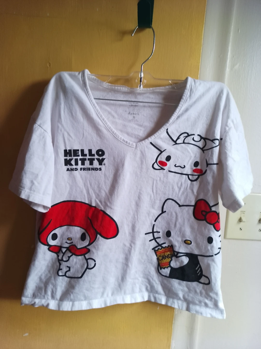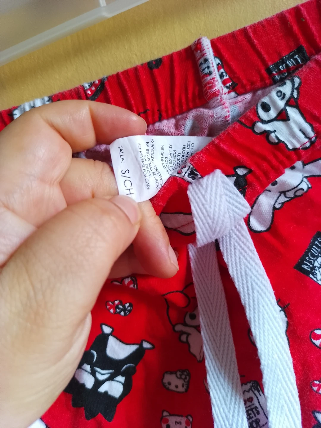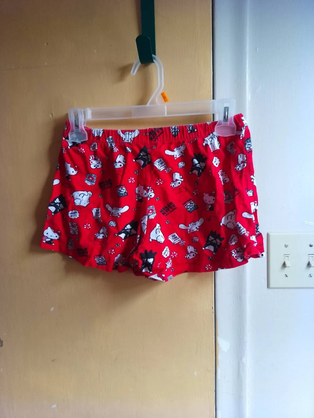 These red pajama shorts feature a fun Hello Kitty and Friends all-over print. They have an elastic waistband and a drawstring. Size is small.