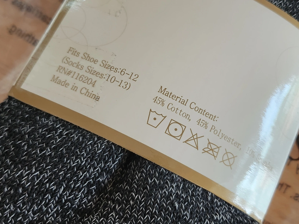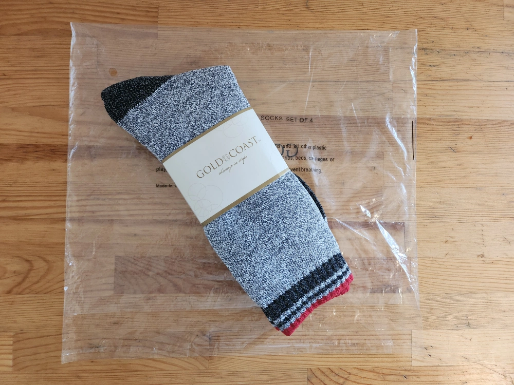Packaged socks. 2 pack. Gray, black, and red design. Fits shoe sizes 6-12. A great way to keep your feet warm and cozy.