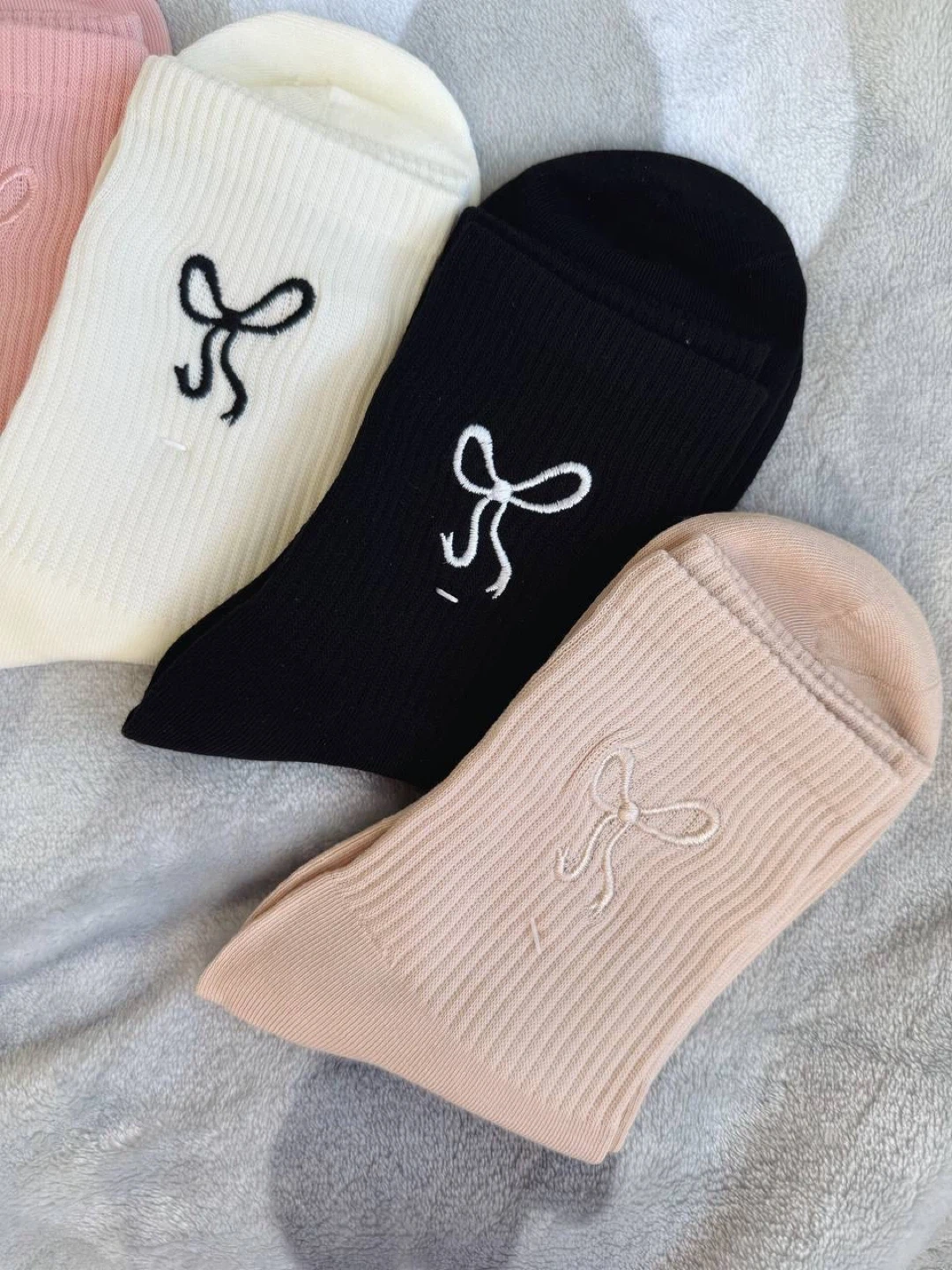 Six pairs of crew socks. Features embroidered bow detail. Available in various colours. Soft and comfortable cotton blend.