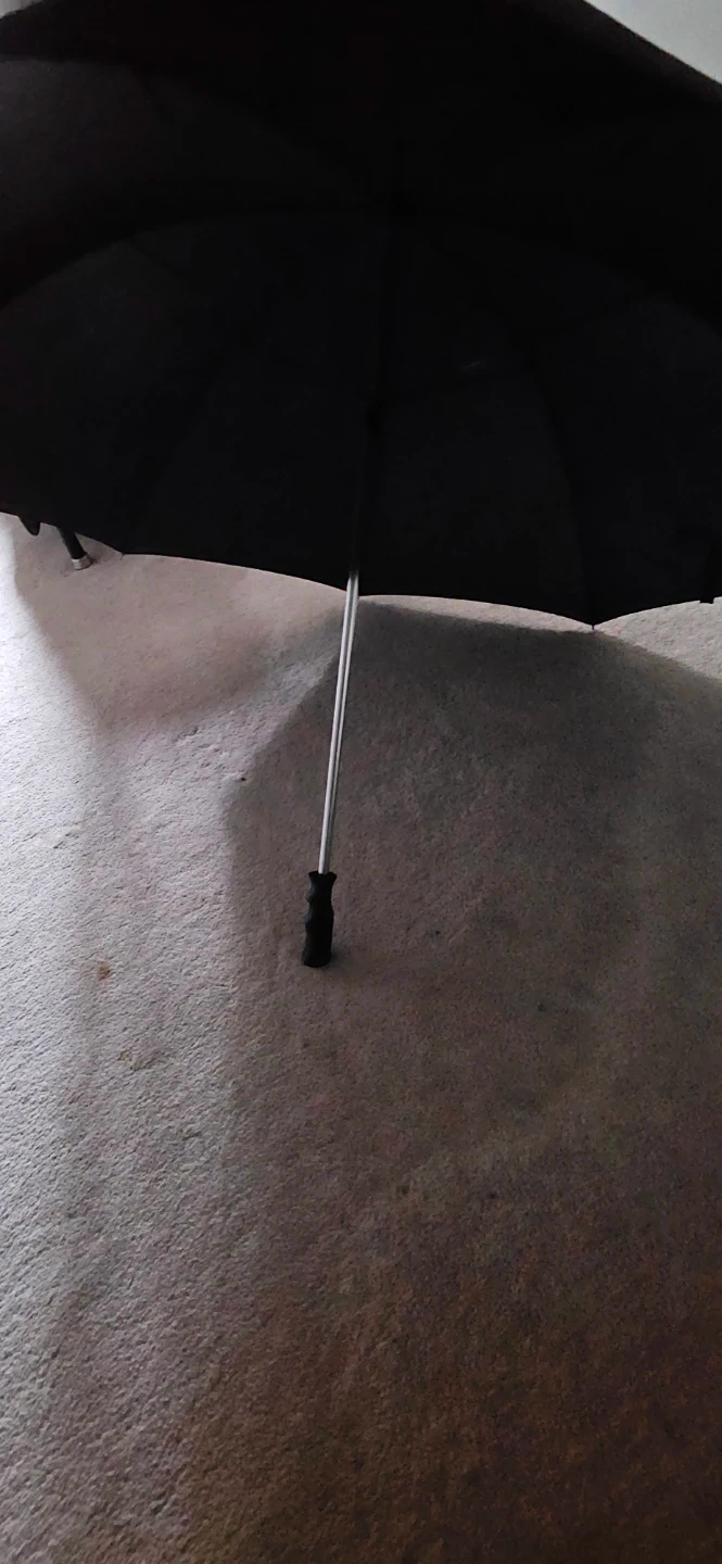 A classic extra large black umbrella for rainy days. It's made with durable fabric and features a comfortable handle for a good grip. This umbrella's simple design makes it a practical accessory for anyone. Ready to keep you dry!