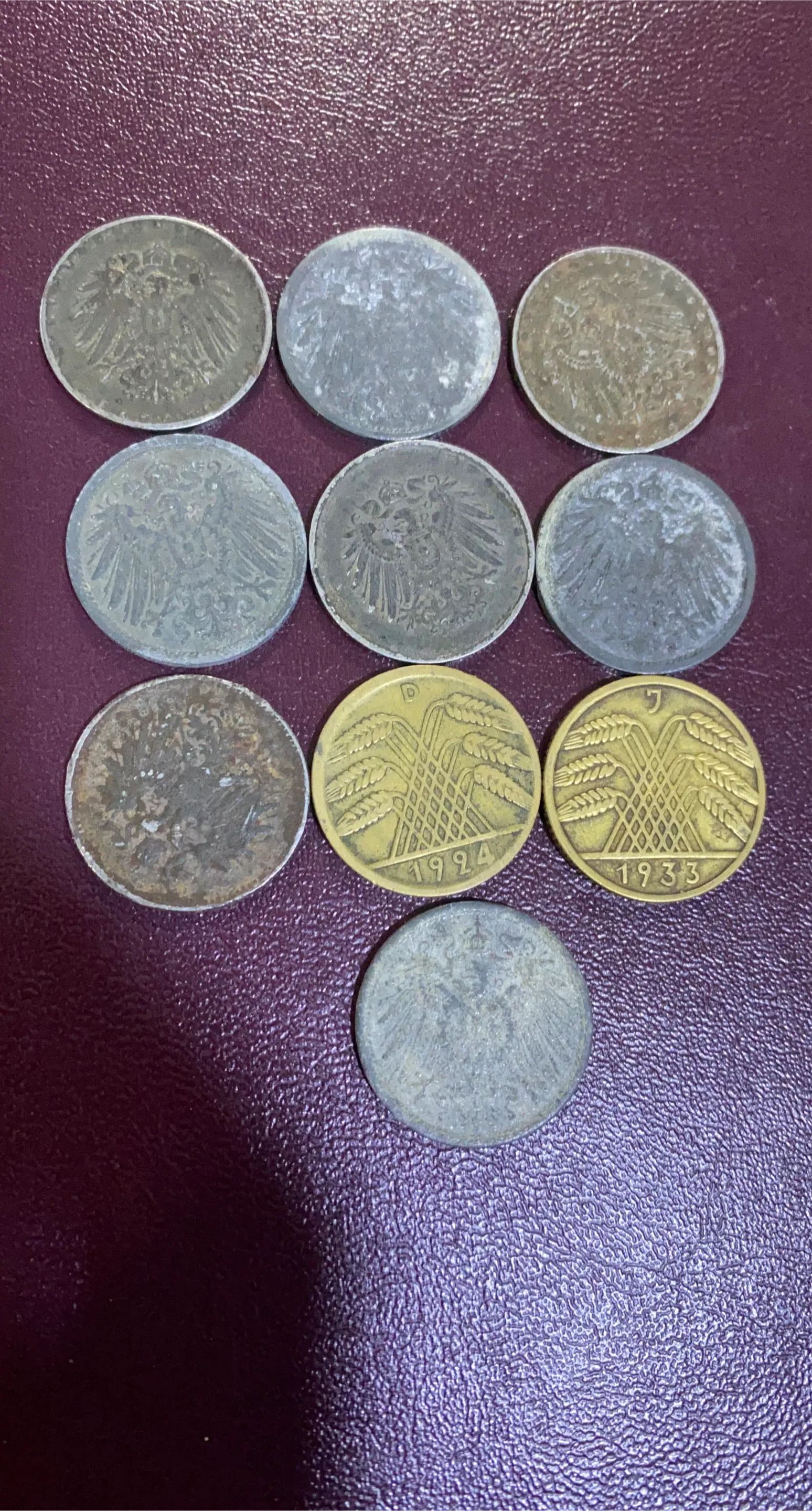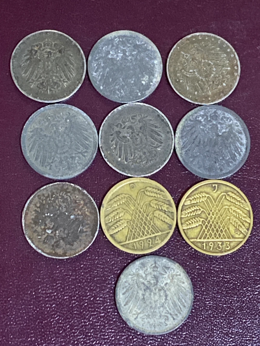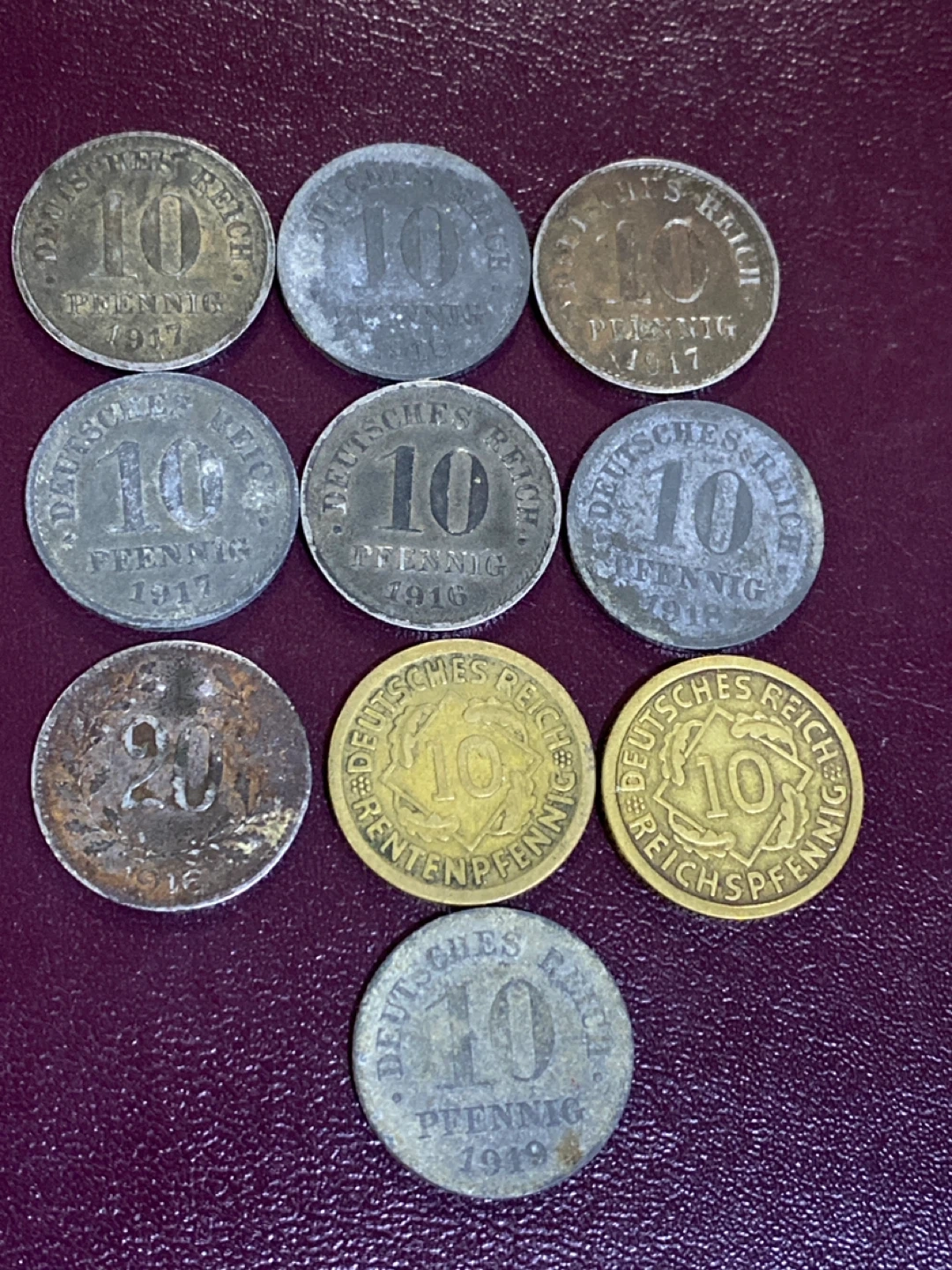 This lot includes several German Pfennig coins from various years, featuring eagles and agricultural motifs. Years visible include 1916, 1917, 1919, 1924, and 1933. These coins are ideal for collectors interested in German numismatics.