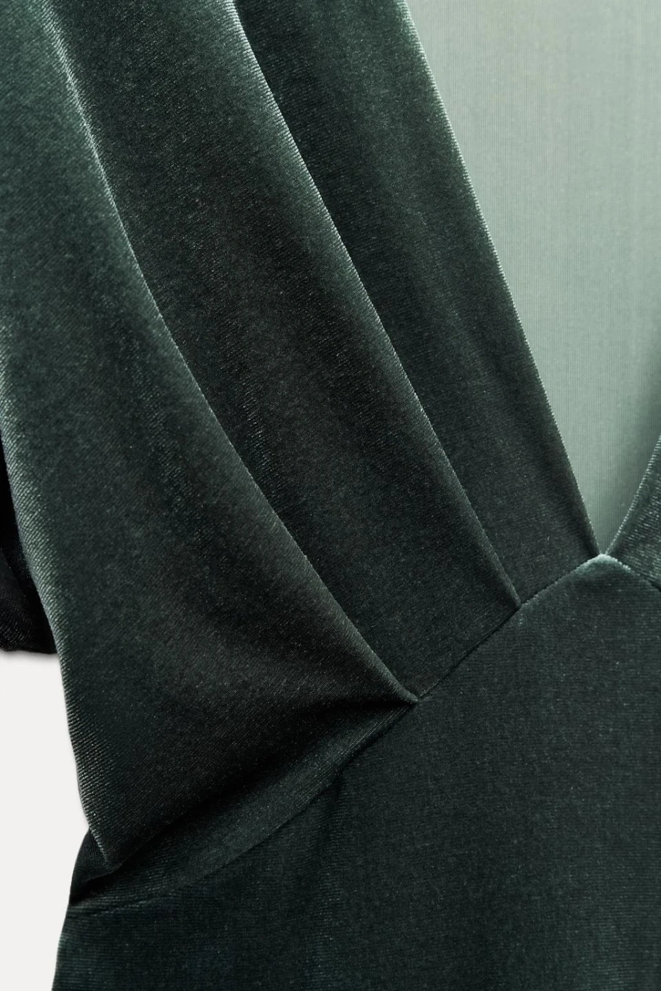 A ZARA velvet midi dress in a dark green hue. It's made with a soft velvet material and features a flattering V-neckline with draped detailing. This dress is great for evening wear or special occasions!