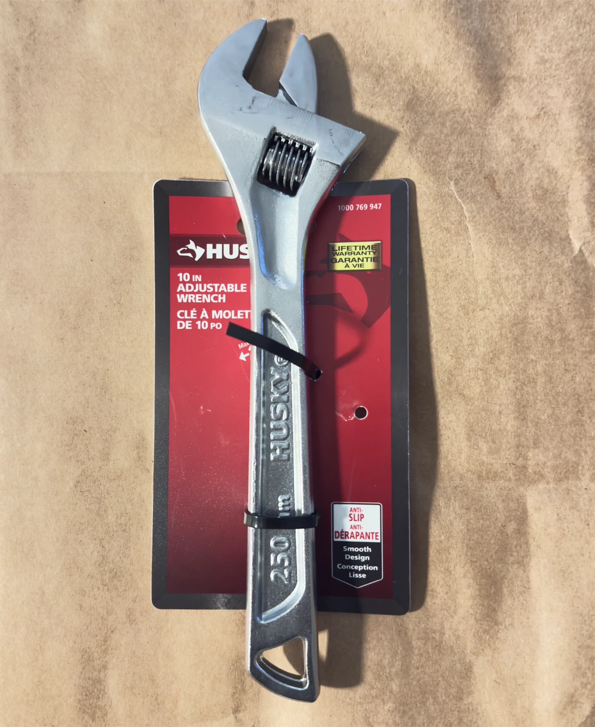 Selling a brand new Husky 10-inch adjustable wrench! It features an anti-slip design and a smooth conception. This tool also comes with a lifetime warranty.
