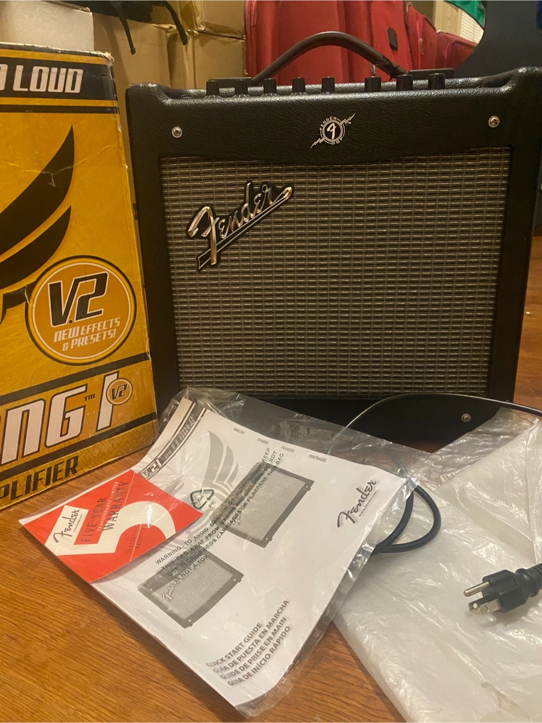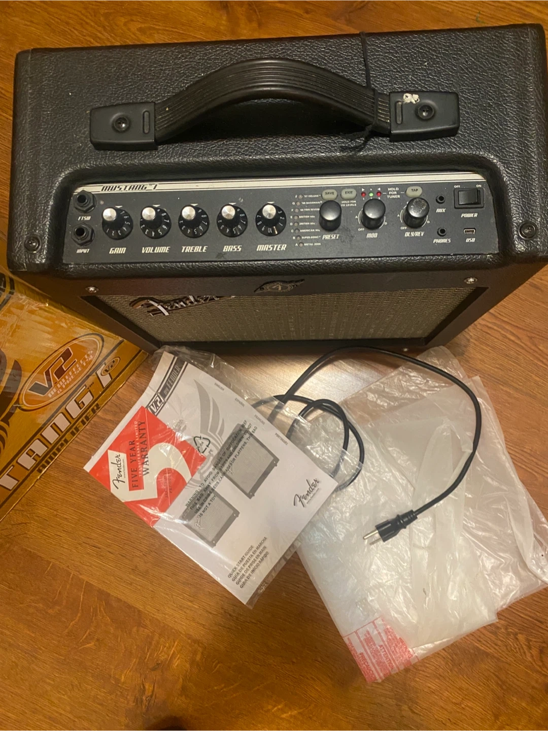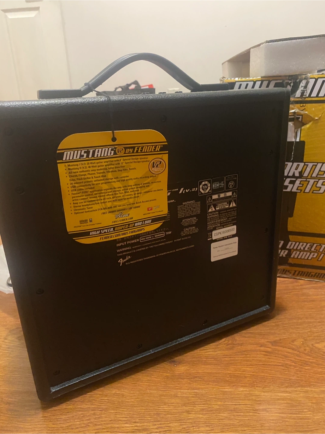 This is a Fender Mustang V2 guitar amplifier. It comes with multiple amp models, effects, and presets. Includes original box and manual. include:- FTSW Output, Guitar Input, Gain, Volume, Treble, Bass, Master Volume, Preset Sound Effects, Mod control, Dly/Rev control, Aux connection, USB and headphones connection. Asking $110 only