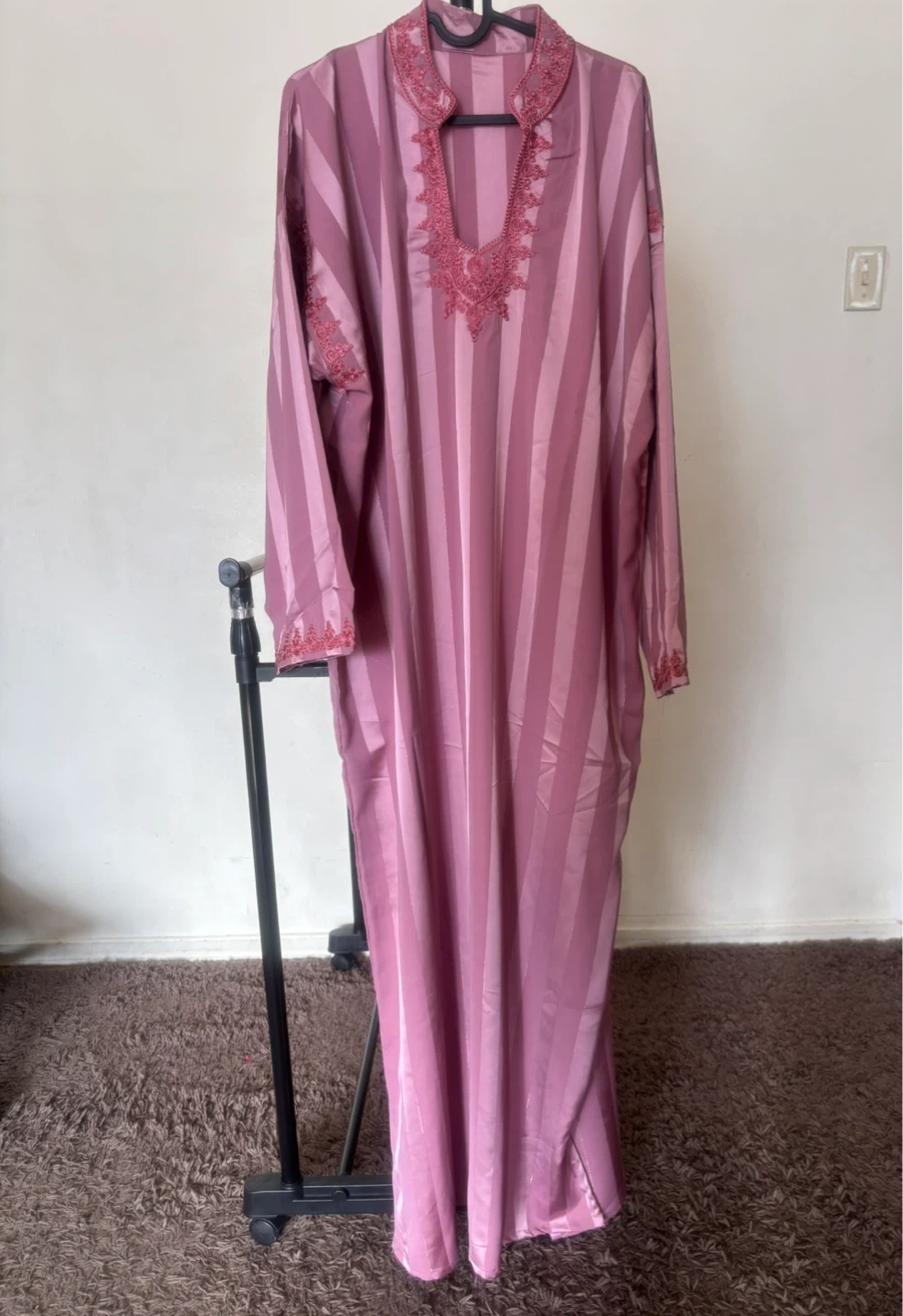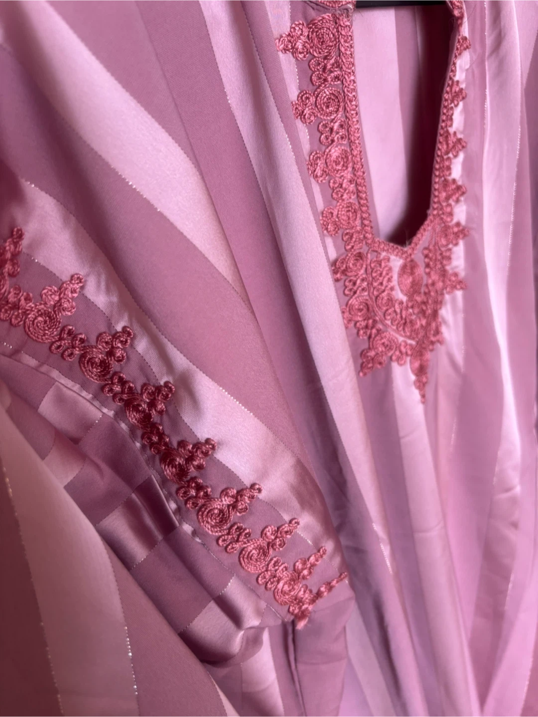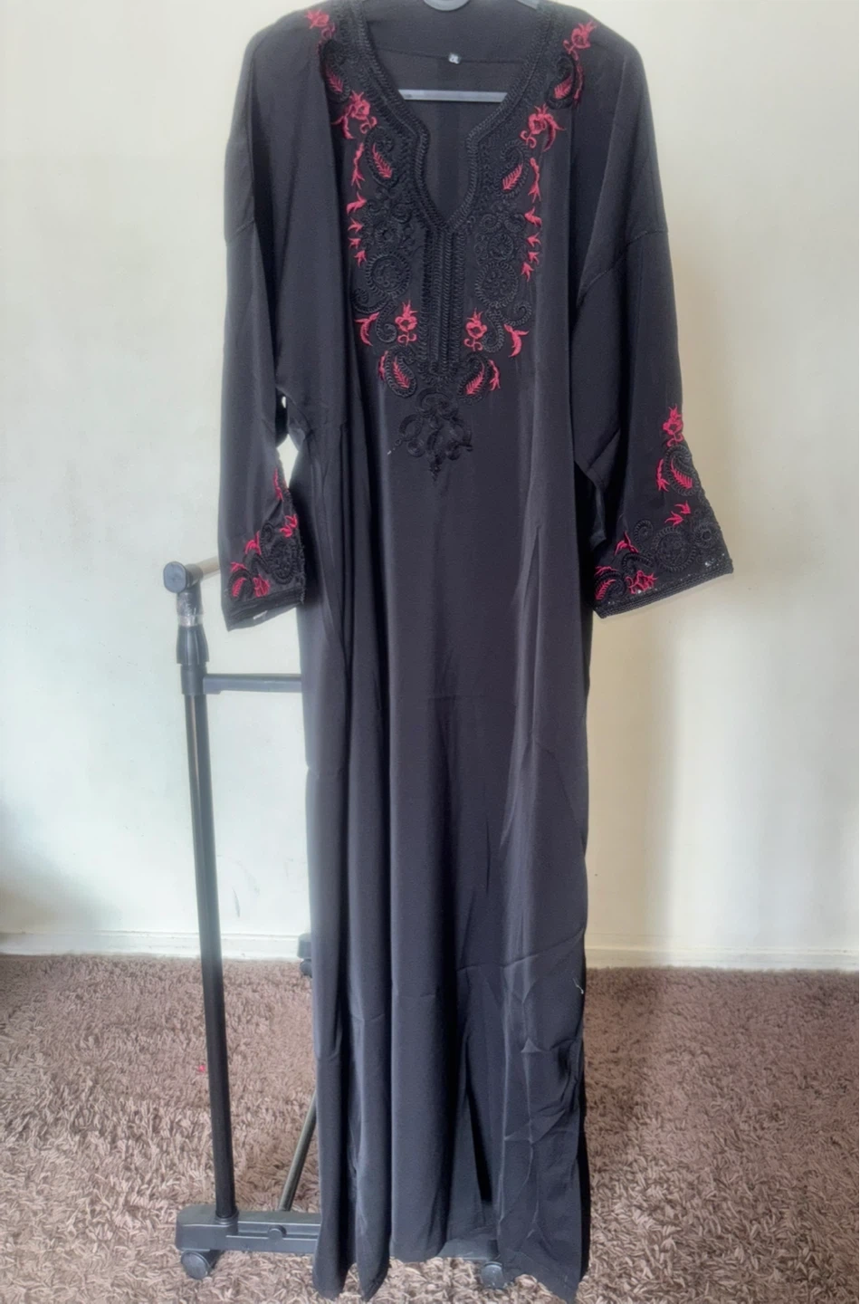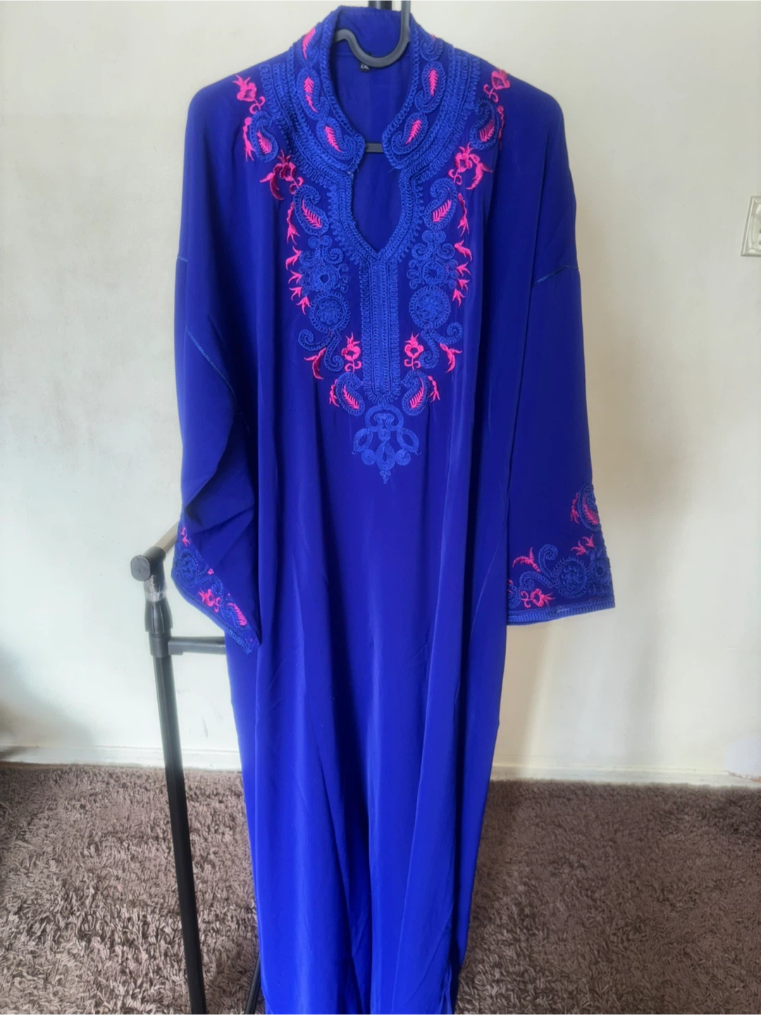 Beautifully embroidered kaftan dress in a vibrant blue. It features intricate pink embroidery around the neckline and cuffs. This stylish piece is perfect for special occasions.