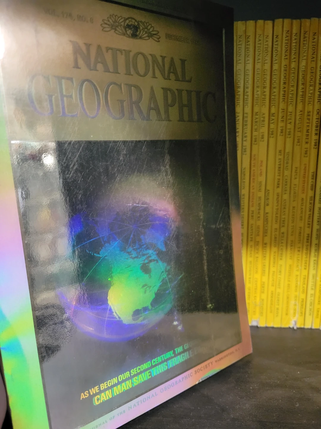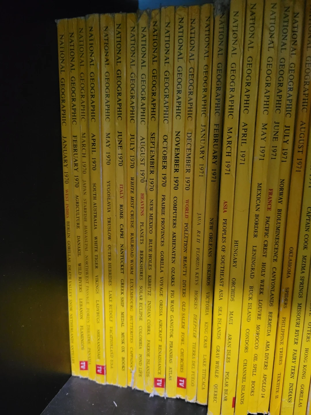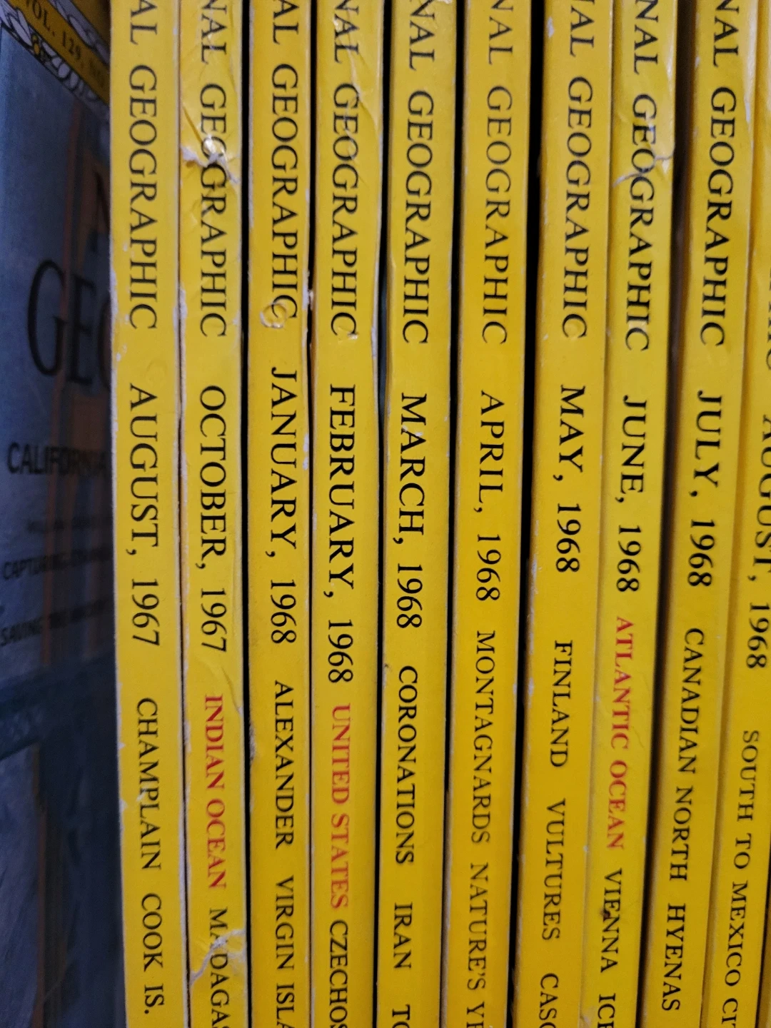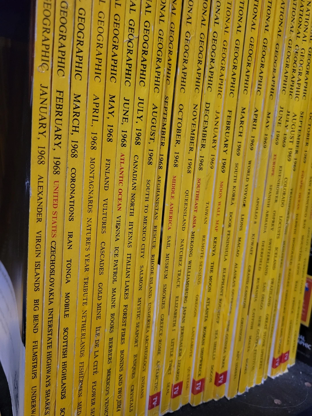 Collection of National Geographic magazines from various years. These issues cover a wide range of topics and are great for collectors or anyone interested in geography and history.