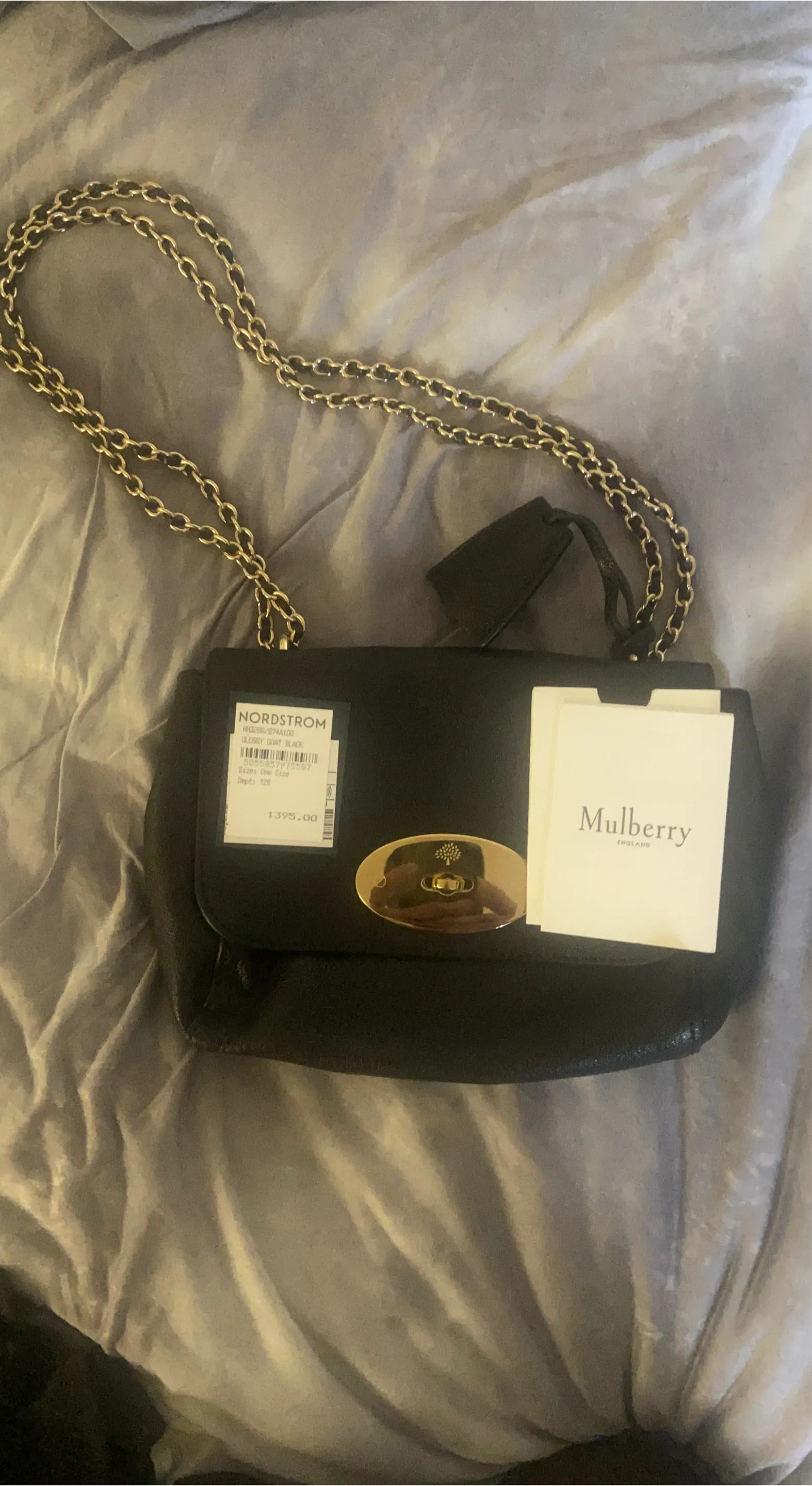 Black Mulberry shoulder bag with a gold chain strap. It's made of glossy goat leather and features a signature Postman's Lock closure. Size is one size.