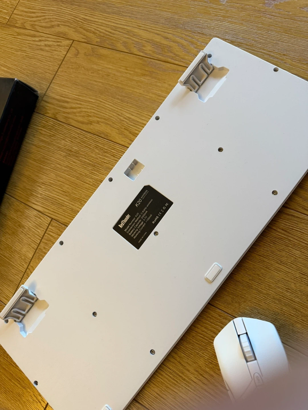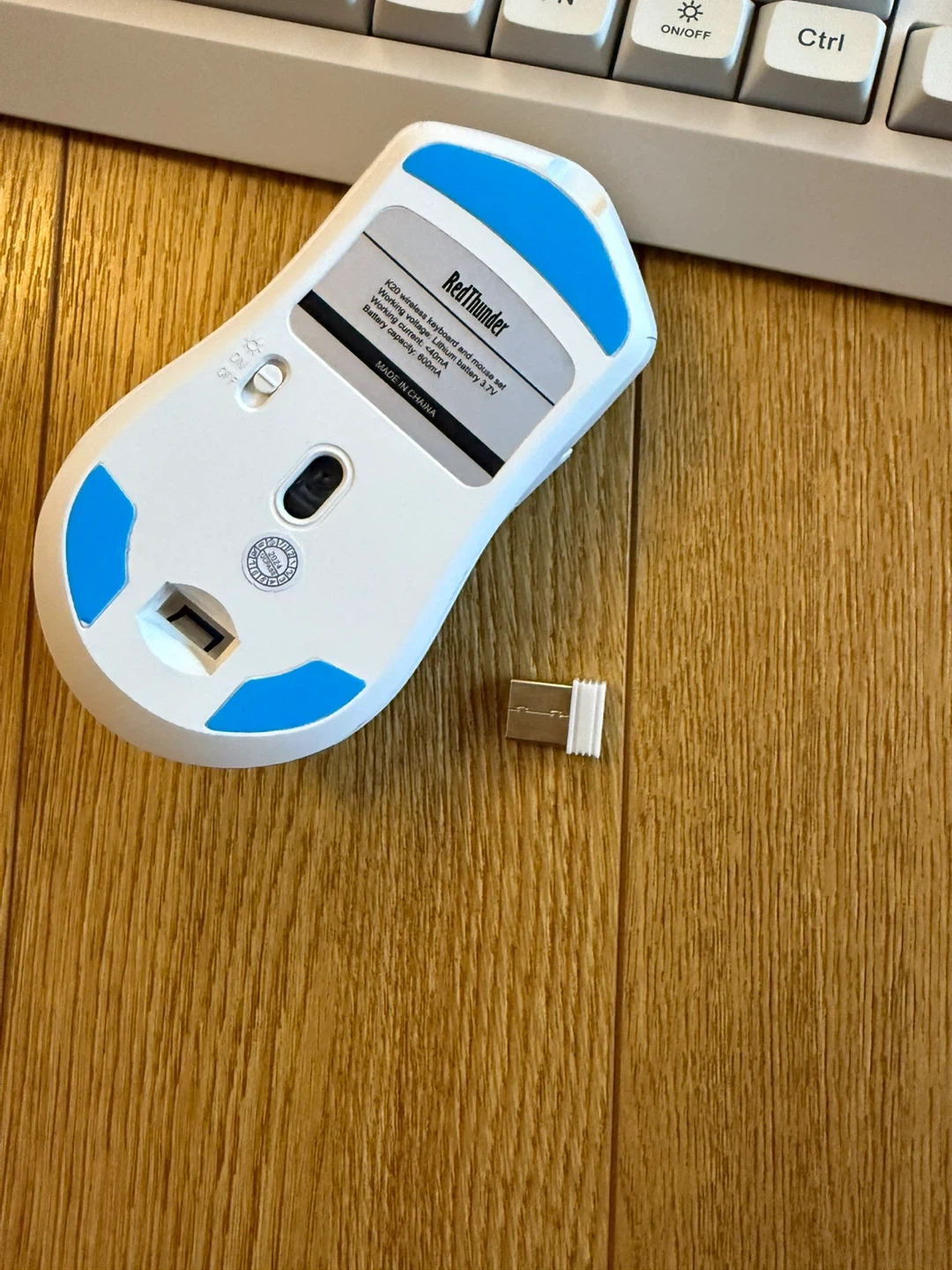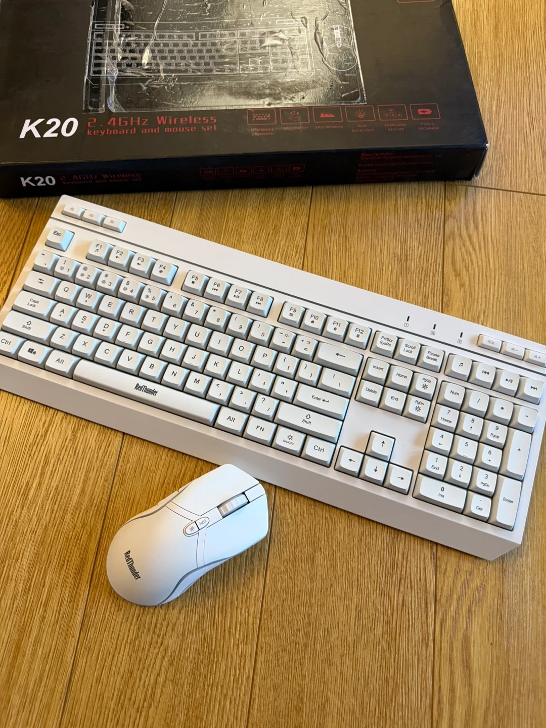 RedThunder K20 wireless gaming keyboard and mouse set. 2 in 1 wireless receiver in the back of the mouse. Brand new white color with light up features which makes it very appealing . Comes with the original box and all components. Full Size Anti-Ghosting Keyboard with Multimedia Keys + 7D 4800DPI Optical Mice, Rechargeable RGB Gaming/Office Set for PC, ps4, ps5, laptop and xbox. When the key response is slow or the light is flashing, please charge it in time. Holds up to 8 hours of charge with lights on. USB cable included. smart energy-saving functions so If there is no operation within 8 minutes, they will automatically go to sleep.