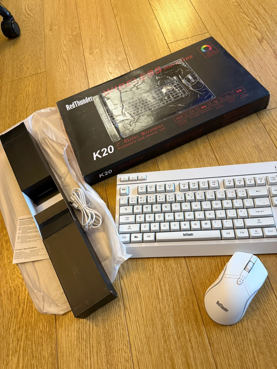 RedThunder K20 wireless gaming keyboard and mouse set. 2 in 1 wireless receiver in the back of the mouse. Brand new white color with light up features which makes it very appealing . Comes with the original box and all components. Full Size Anti-Ghosting Keyboard with Multimedia Keys + 7D 4800DPI Optical Mice, Rechargeable RGB Gaming/Office Set for PC, ps4, ps5, laptop and xbox. When the key response is slow or the light is flashing, please charge it in time. Holds up to 8 hours of charge with lights on. USB cable included. smart energy-saving functions so If there is no operation within 8 minutes, they will automatically go to sleep.