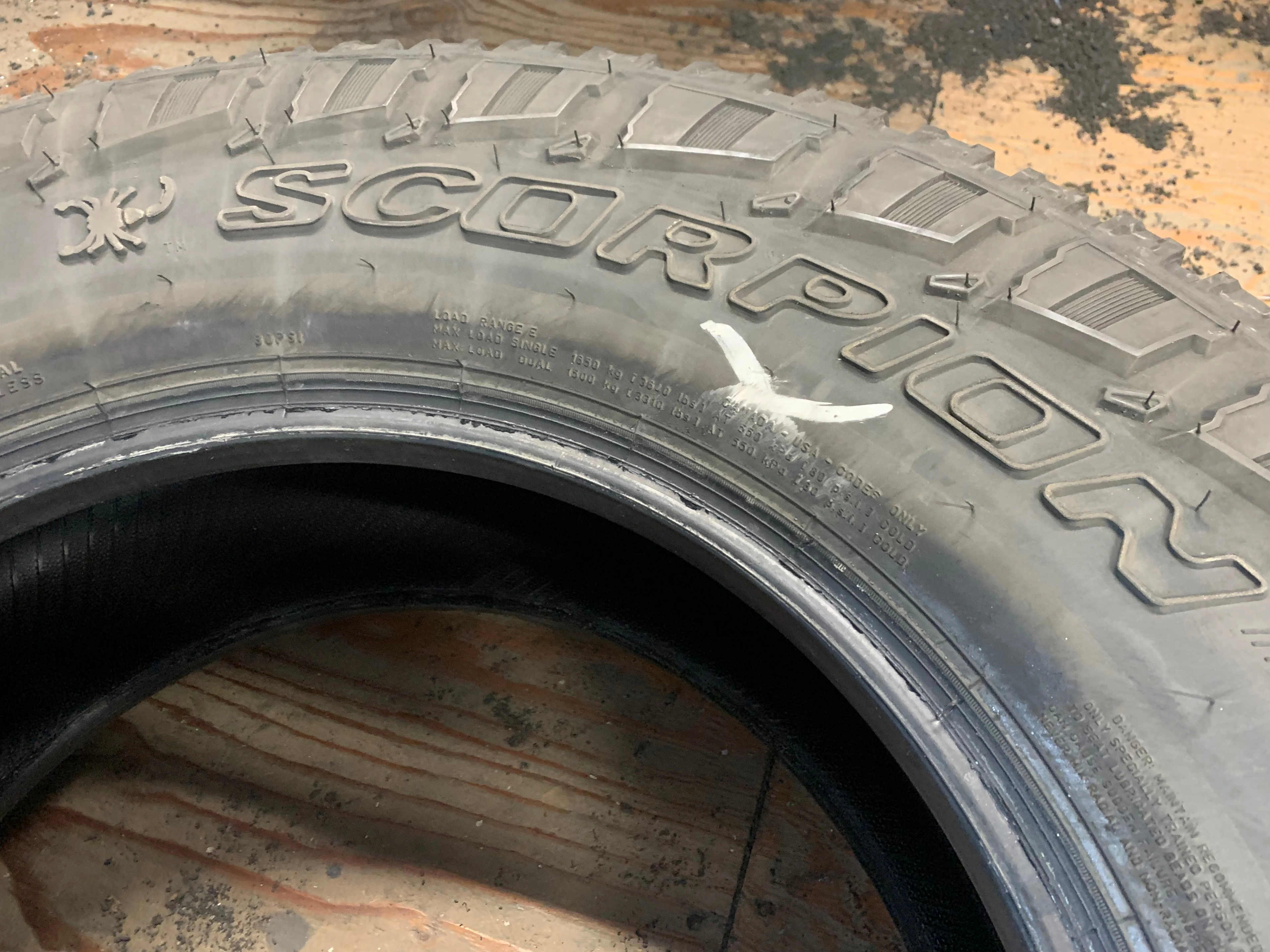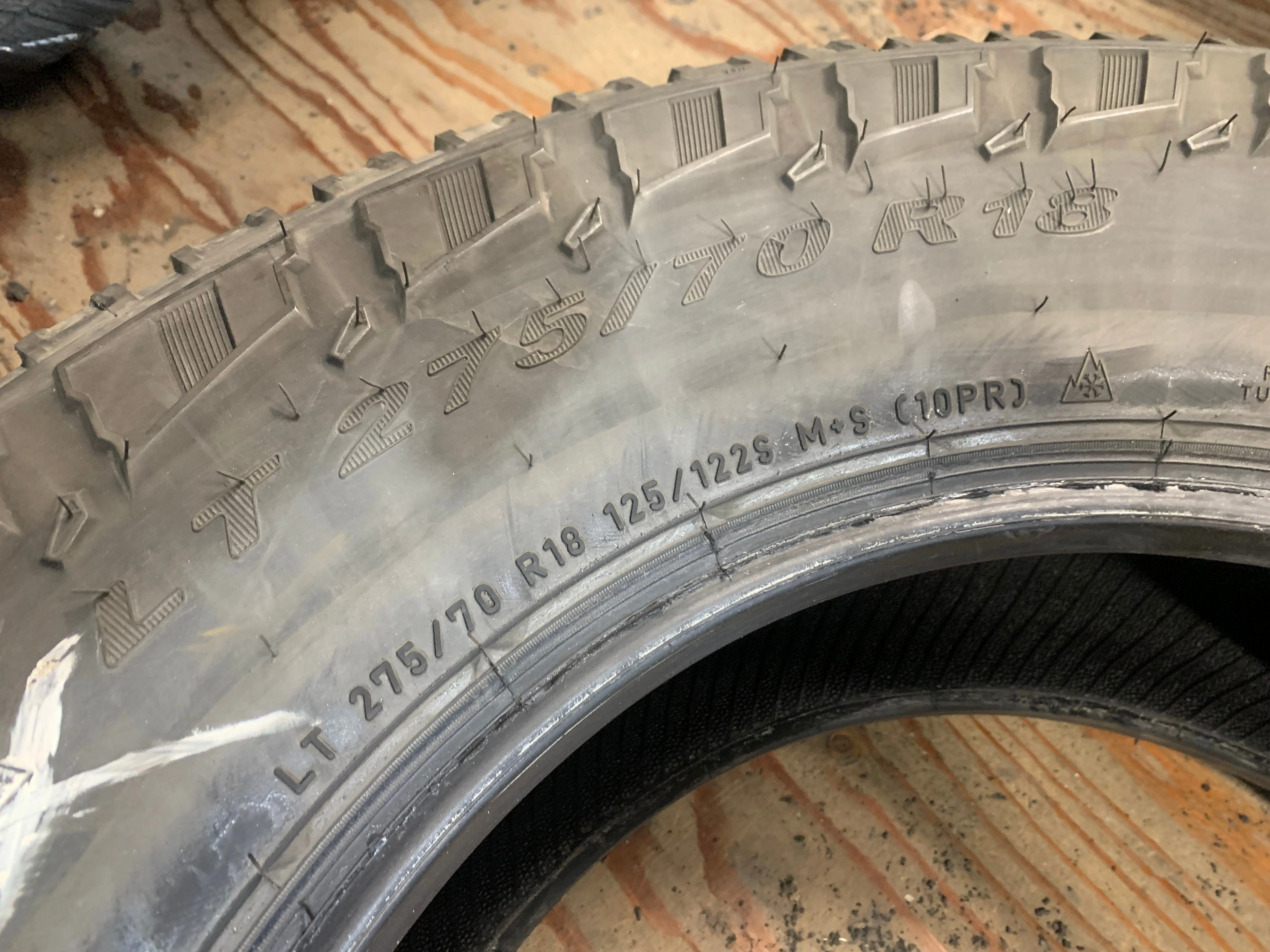 size LT 275/70/18 125/122S 10PR Pirelli Scorpion All Terrain Plus with no repairs and 9/32 70% tread