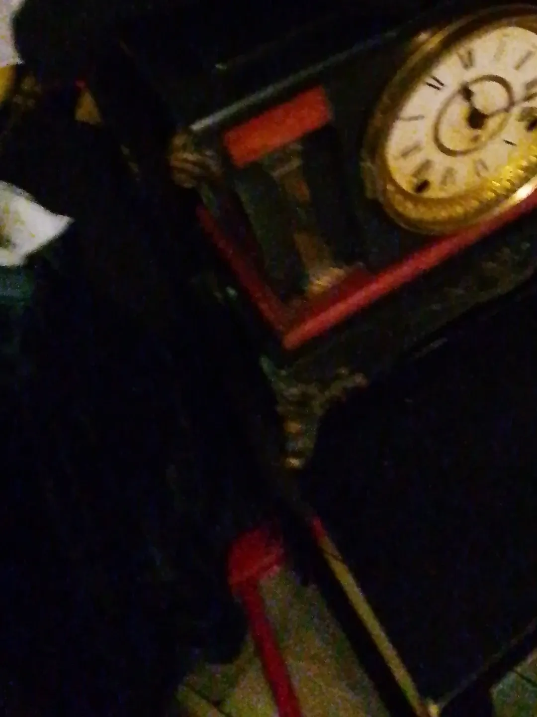 A decorative mantel clock with a classic Roman numeral face. It features ornate gold detailing and a dark wood or metal casing with red accents. This clock would make a statement piece in any room.