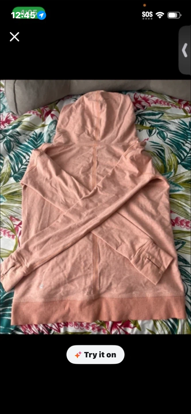 A Lululemon hooded long sleeve shirt in a peachy coral colour. It has thumbholes for extra coverage. This shirt is made of a breathable fabric, perfect for active days! Size small pick up cash only