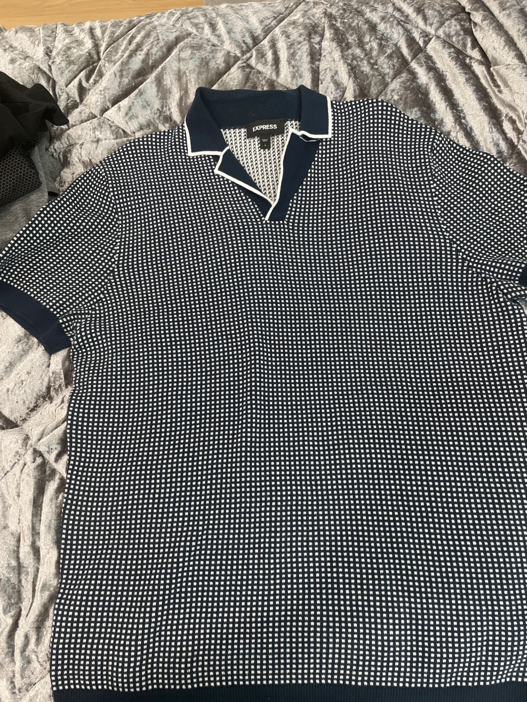 This is a navy blue Express polo shirt. It has a unique pattern and a contrasting white collar. It's in great condition and ready for a new home