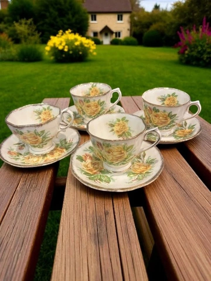 Bring timeless elegance to your table with these beautiful dishes and teacups from the discontinued Royal Albert “Tea Rose” collection. Featuring a classic yellow rose design with gold gilded edges, this fine bone china set was Made in England in the 1980s and is now a highly collectible, rare, discontinued pattern.