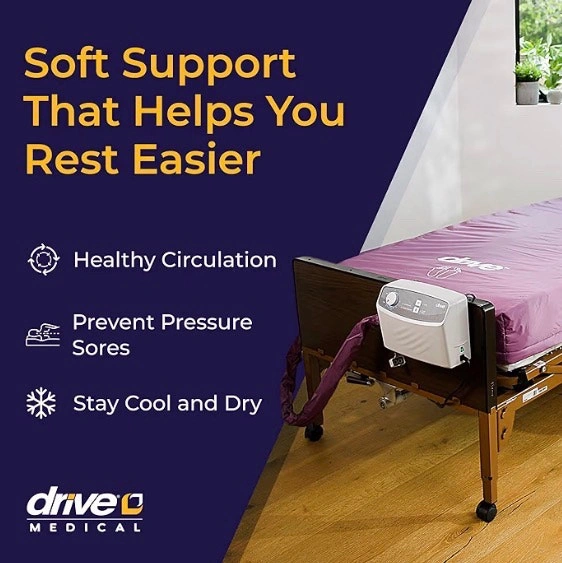 Like new low-air-loss pressure air mattress and customizable pump for bedsore (pressure ulcer) prevention. Make: Drive Model: 14027. This active mattress replacement system provides both alternating pressure and low air loss to optimize pressure redistribution, shear/friction reduction, and microclimate control. Specifically used for bedsore treatment and prevention. For home use only. The 20 individual air bladders can be customized to whatever firmness or softness desired for the mattress user via the pump. The dimensions are 36”x 80” and the height is 8”. A fully electric adjustable bed (with full-length or half-length side rails) is also available for an extra $300. Cash accepted.