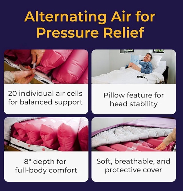 Like new low-air-loss pressure air mattress and customizable pump for bedsore (pressure ulcer) prevention. Make: Drive Model: 14027. This active mattress replacement system provides both alternating pressure and low air loss to optimize pressure redistribution, shear/friction reduction, and microclimate control. Specifically used for bedsore treatment and prevention. For home use only. The 20 individual air bladders can be customized to whatever firmness or softness desired for the mattress user via the pump. The dimensions are 36”x 80” and the height is 8”. A fully electric adjustable bed (with full-length or half-length side rails) is also available for an extra $300. Cash accepted.