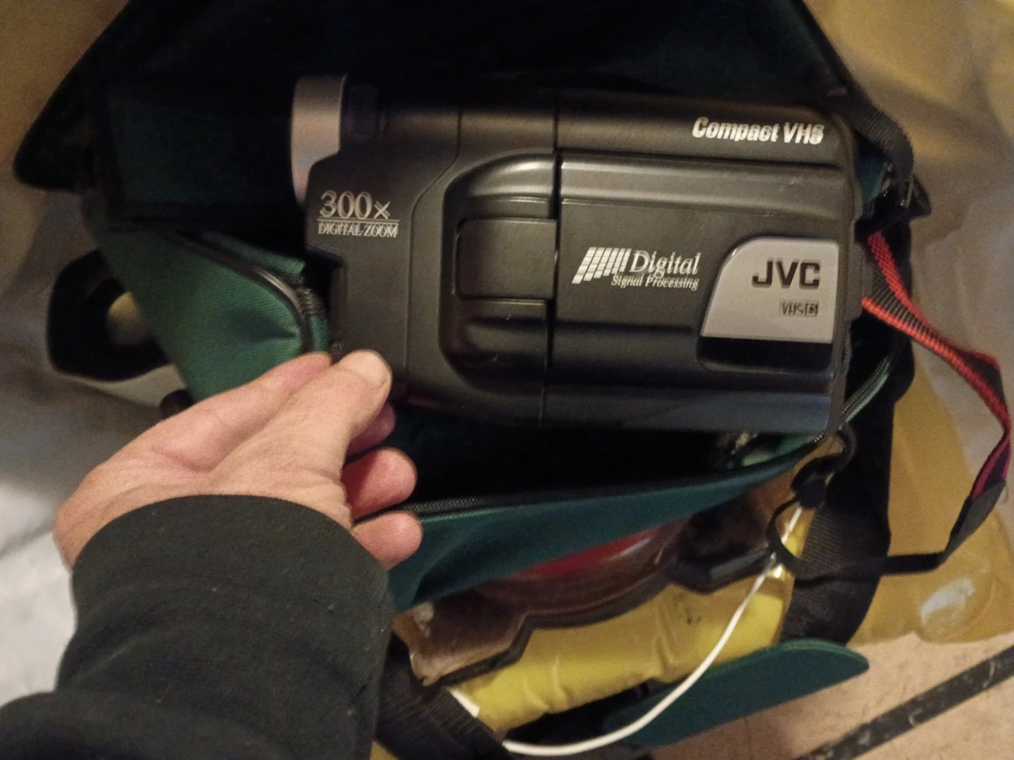 This JVC camcorder records in Compact VHS format and features 300x digital zoom. It includes a carrying bag for easy transport. A manual is also provided.