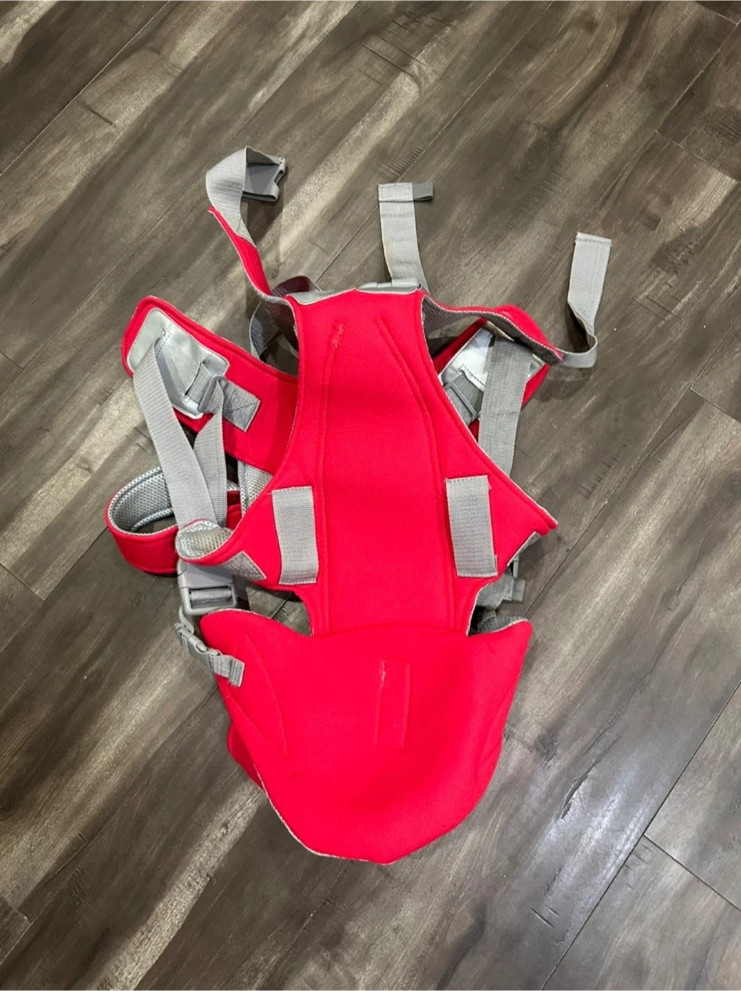 This is a red baby carrier with adjustable straps. It's designed for comfort and convenience. The carrier is made from durable fabric.