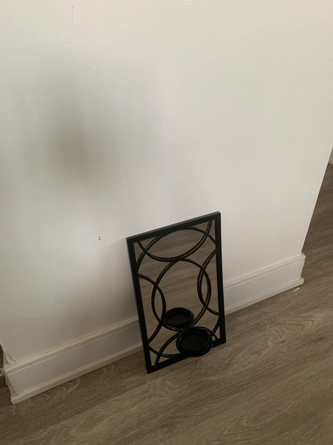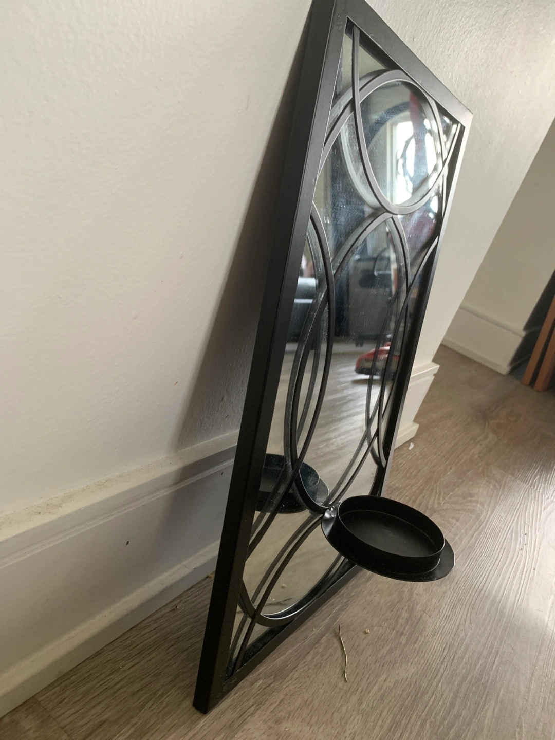 Ornate black metal framed mirror. Features a candle holder. Perfect for adding a touch of elegance to any room.