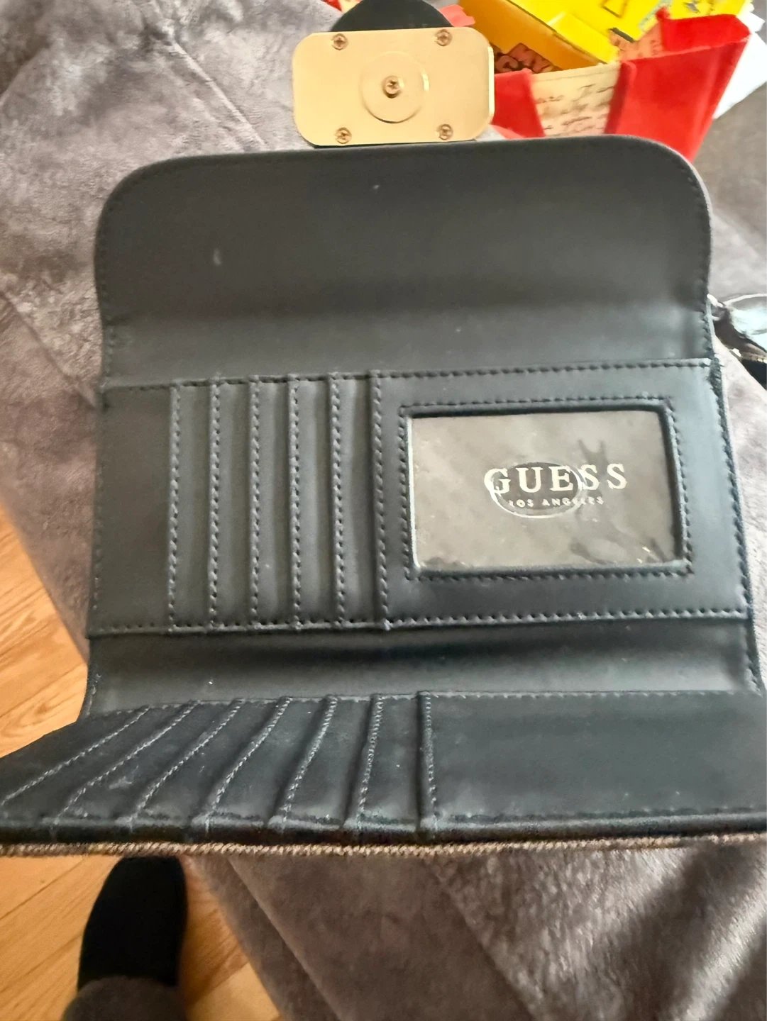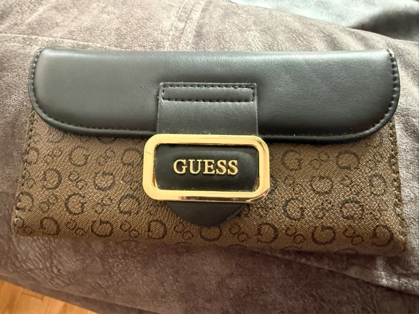 This is a Guess wallet with a brown monogram pattern. It features multiple card slots and a clear ID window. A zippered compartment is also included for extra storage.