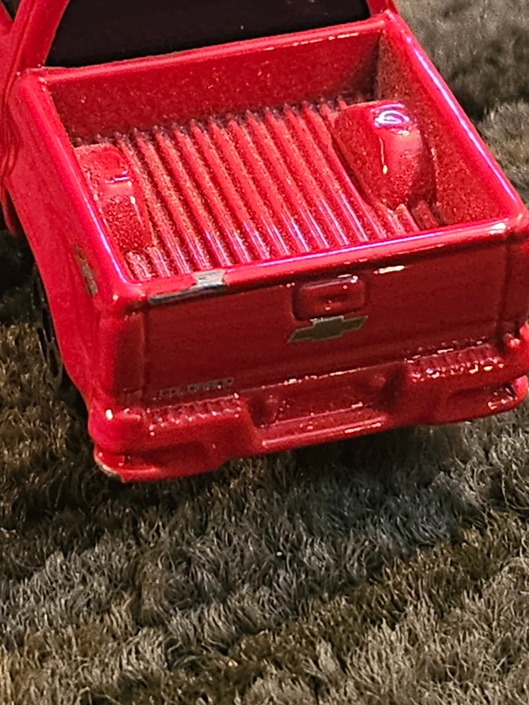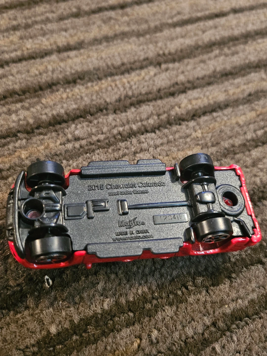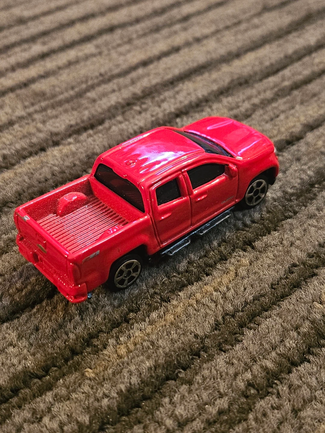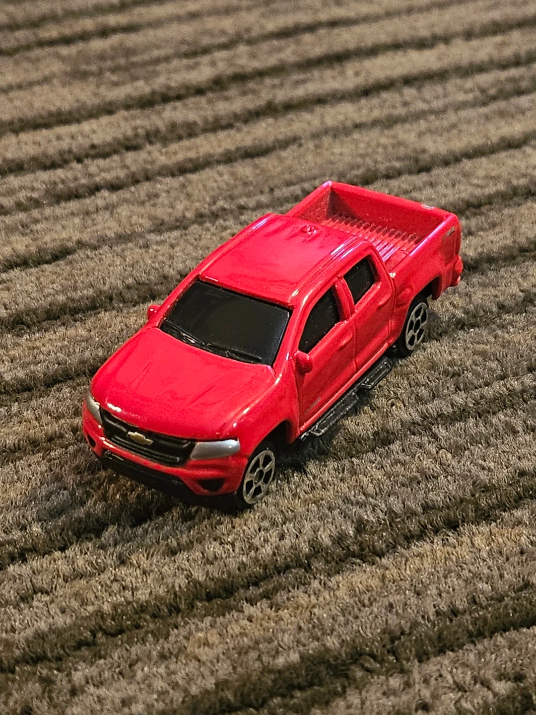 This is a red 2015 Chevrolet Colorado die-cast truck. It's made by Hot Wheels and manufactured in China. The toy truck is a great collectible for car enthusiasts!